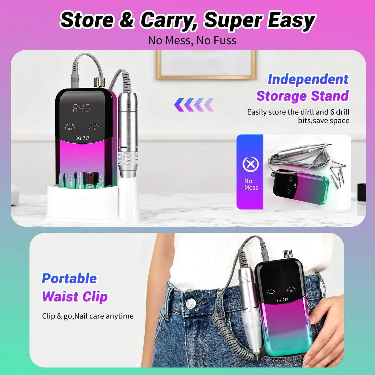 More Convenient Design:The nail drill is equipped with a hanging back clip and an independent stand. It stands stably when in use, and is easy to carry via the back clip when not in use. It also includes a detachable embedded drill bit placer (with a hole on the left side of the main body), making it more convenient to use.