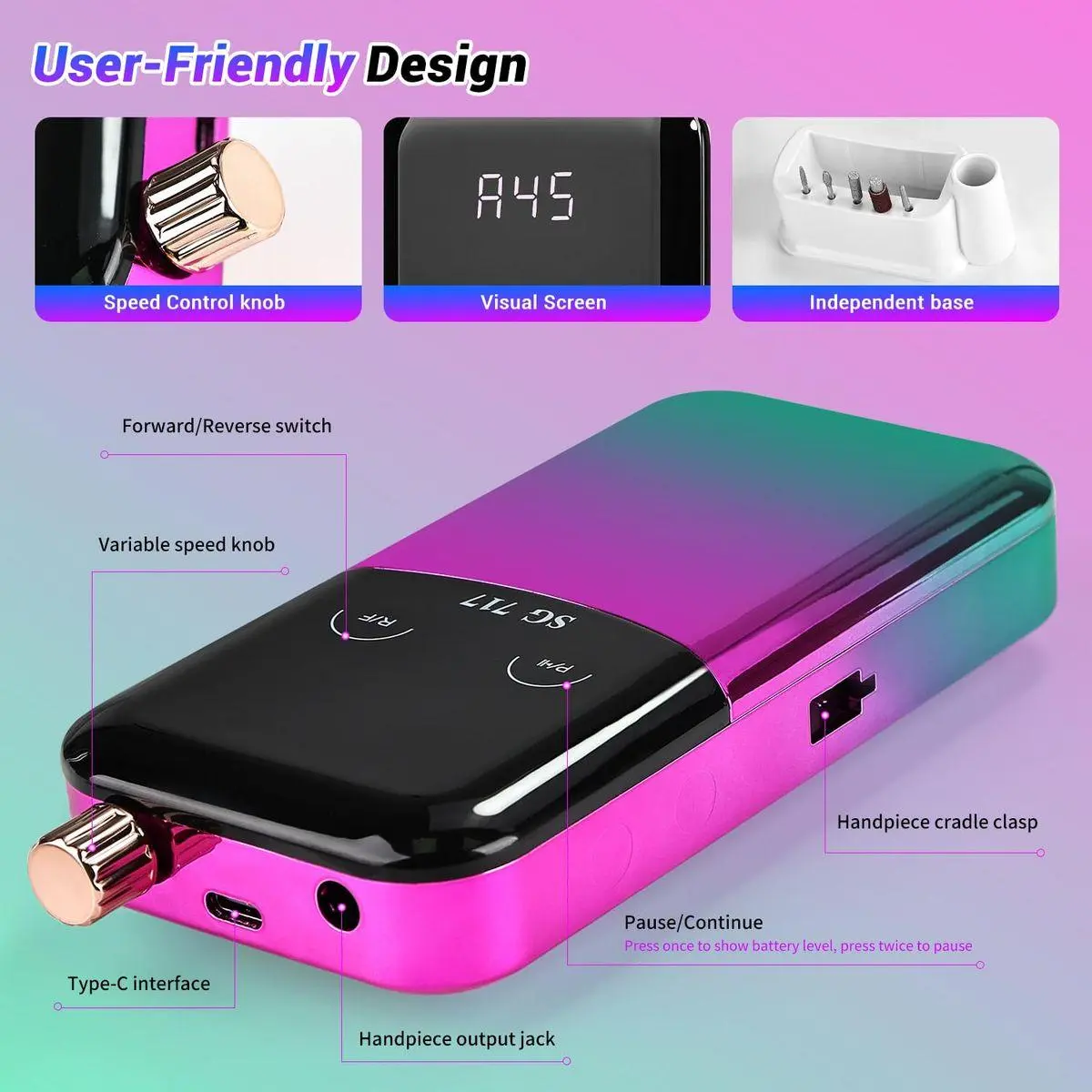 Easy to operate and user-friendly: JEWHITENY nail drills have a simple and convenient design. You can control the speed through the knob at the top, and through touch screen buttons easily control the direction, check the battery level, pause the operation.It's really easy to operate - even those who are trying nail art for the first time can easily use it.