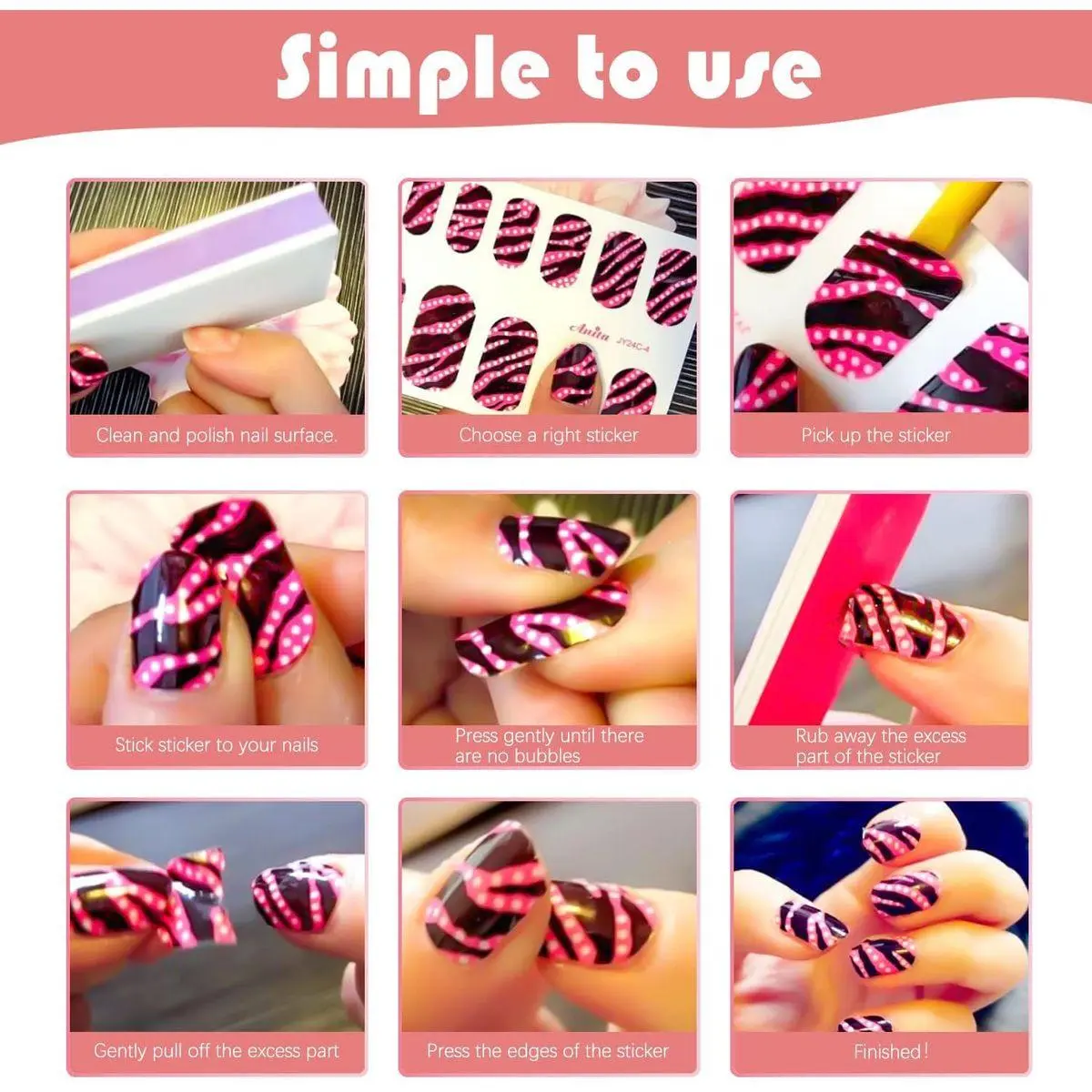 [Package Included] You will get 16 sheets full nail wraps, each nail strips has 14 pieces nail tips and 7 sizes, to suitable for most people's nail size. the attached nail file and cuticle stick will help you finish the nail work better.
