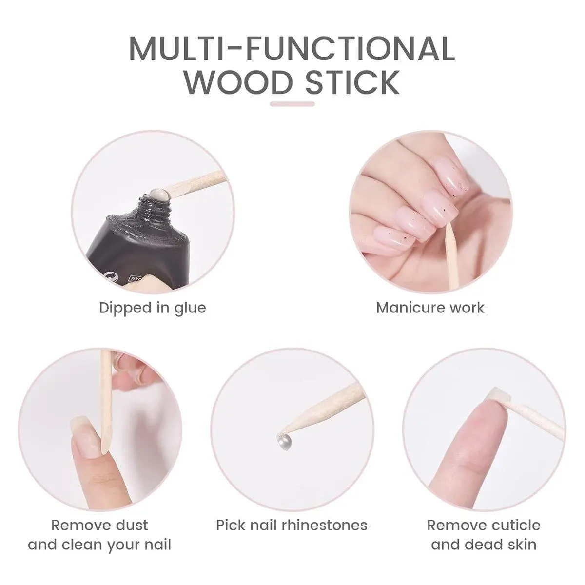 Small stick with big function:Spade shape at one end and sharp tip and the other,can easily push unsightly cuticles and dead skin off your fingernails with this disposable orange wood stick.