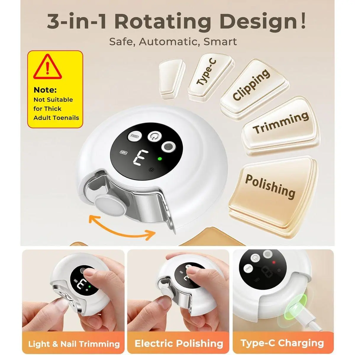 【Safe & Ingenious Design】 Safety is always our top priority. The blades of the nail clippers are hidden in the curved groove and will never touch the skin, so you don't need to worry about hurting your or your baby's skin. It integrates the trimming head, polishing head and charging port into one, which is convenient for storage and more beautiful. By rotating to select different functional heads, it is practical and interesting at the same time