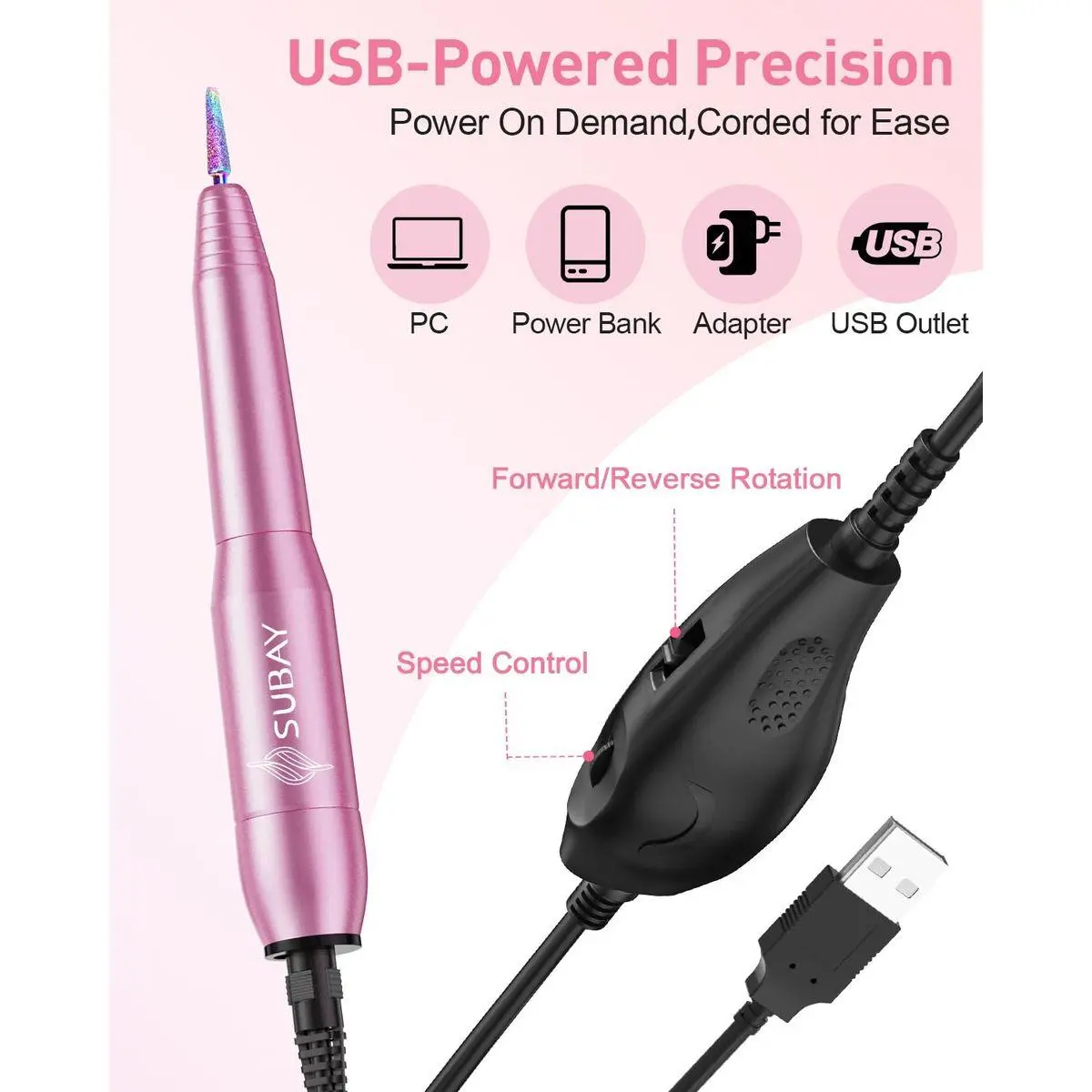 ERGONOMIC DESIGN AND PORTABLE NAIL DRILL: The electric nail drill features a new pen-shaped handle that is small, lightweight and ergonomically designed for a comfortable grip. Its portable design allows users to practice nails anytime, anywhere. Standard USB port makes it easy to connect any USB device(NOTE: The adapter is not included)