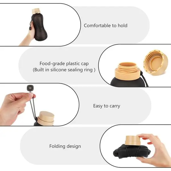 Collapsible silicone water bottle with a silicone drawstring is ideal for various activities. Perfect for traveling, gym, biking, running, camping, fishing, hiking, mountaineering, yoga, beach, and outdoor sports. Its folded size is easy to carry, making it a travel essential.