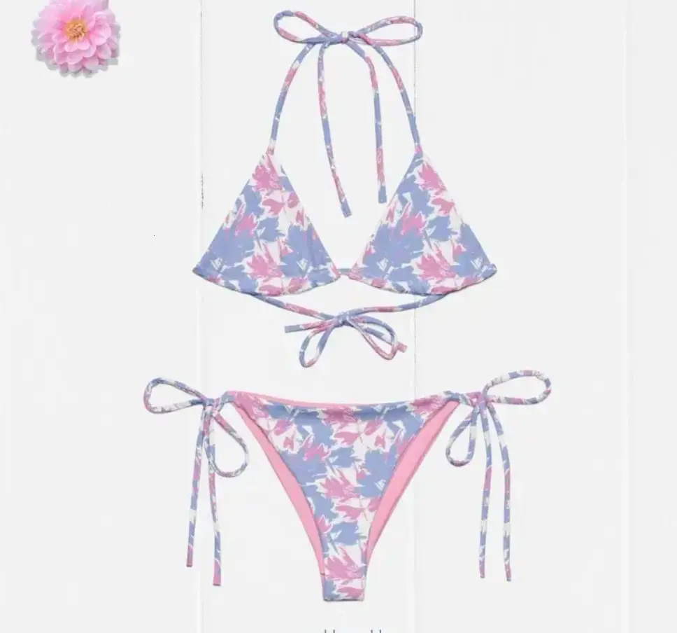 ·Two-piece design with classic triangle bikini top and matching string-tie bottoms