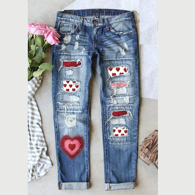 Valentine's Day heart-shaped patch printed jeans, retro ripple design, cat whisker craftsmanship, elastic and comfortable fabric, perfect fit long denim jeans, patch ripple jeansRAIMENTRY