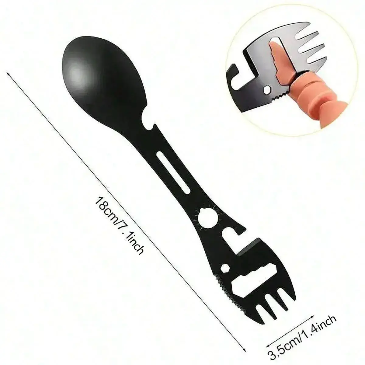 【10-in-1 Functionality】: This multifunctional spoon combines ten useful tools like a can opener and saw blade into one compact item. 【Portable Design】: Made of stainless steel, this cutlery is lightweight and easy to carry for outdoor adventures and travel. 【Durable Material】: Crafted from high-quality stainless steel, it ensures long-lasting use without rust or corrosion, perfect for repeated use. 【Versatile Use】: Includes essential tools like a wrench and a directional indicator, catering to diverse needs while camping or picnicking. 【Compact Storage】: Easily fits in a bag or pocket, making it a convenient choice for meals on the go, ensuring readiness at all times.