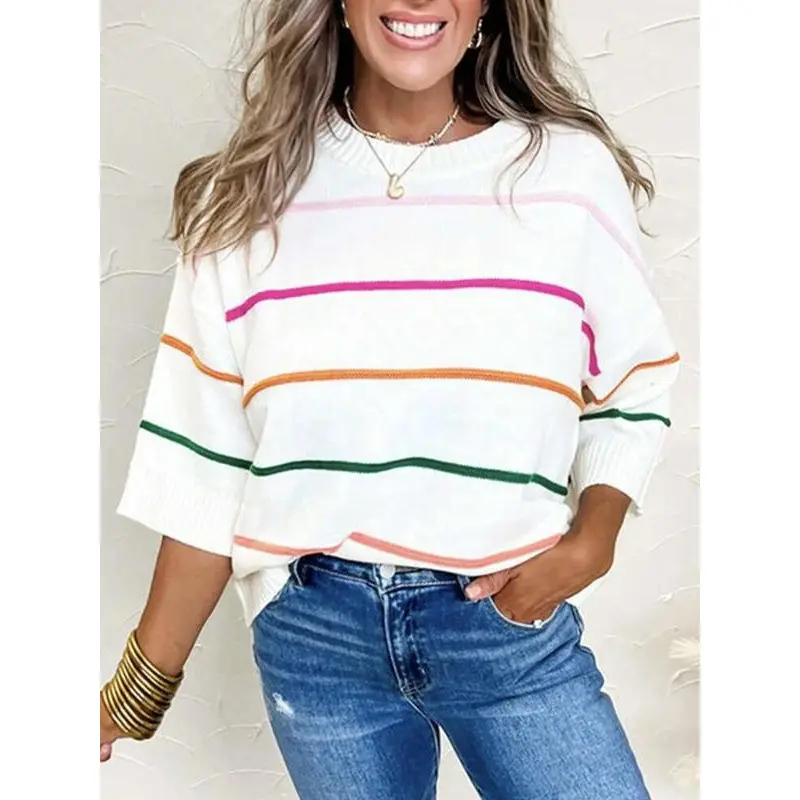 New autumn and winter color blocked striped off shoulder sweater, casual loose knit pullover, elegant rainbow striped women's fashionable knit sweaterRAIMENTRY