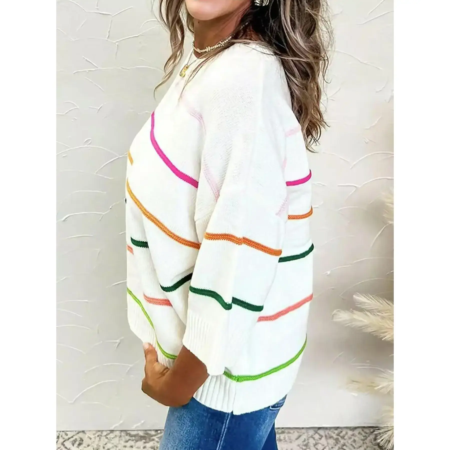 【Unique Stripes】: Features vibrant rainbow stripes, setting it apart from typical knitwear with an eye-catching visual appeal. 【Loose Fit】: Designed for a relaxed silhouette, allowing for easy layering and movement in varying temperatures. 【Moderate Thickness】: Crafted with moderate fabric thickness, suitable for fall and winter seasons, balancing warmth and breathability. 【Knit Fabric】: Constructed from quality knit fabric, ensuring durability while maintaining a soft texture against the skin. 【Shoulder Drop】: Incorporates a drop shoulder style, enhancing the relaxed feel and providing a modern touch to the garment.