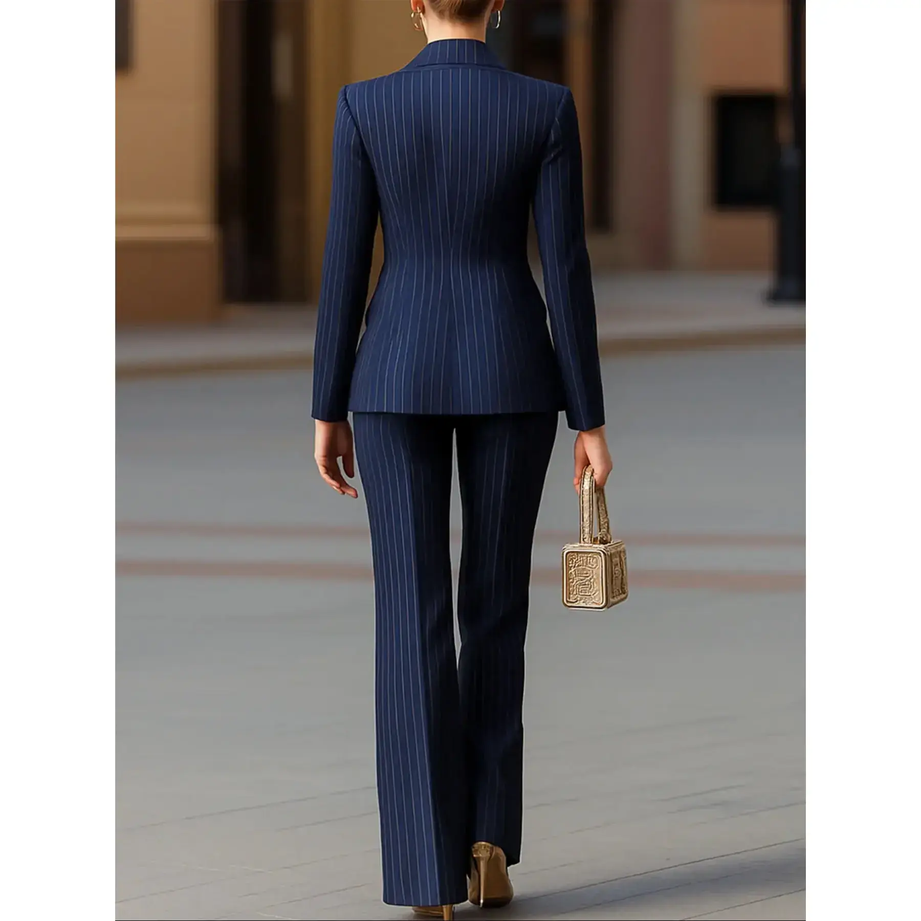 【Double-Breasted Closure】: Featuring a double-breasted button front that adds a structured element to the silhouette. 【Striped Pattern】: Adorned with a striped pattern, providing a refined and textured appearance that stands out. 【Slim Fit】: Designed with a slim-fitting cut that enhances the shape, suitable for professional settings. 【Long Pants】: Includes long pants providing full coverage, making it suitable for the autumn and winter seasons. 【Regular Length Tops】: Tops are of regular length, ensuring compatibility with various types of bottoms for a cohesive look.