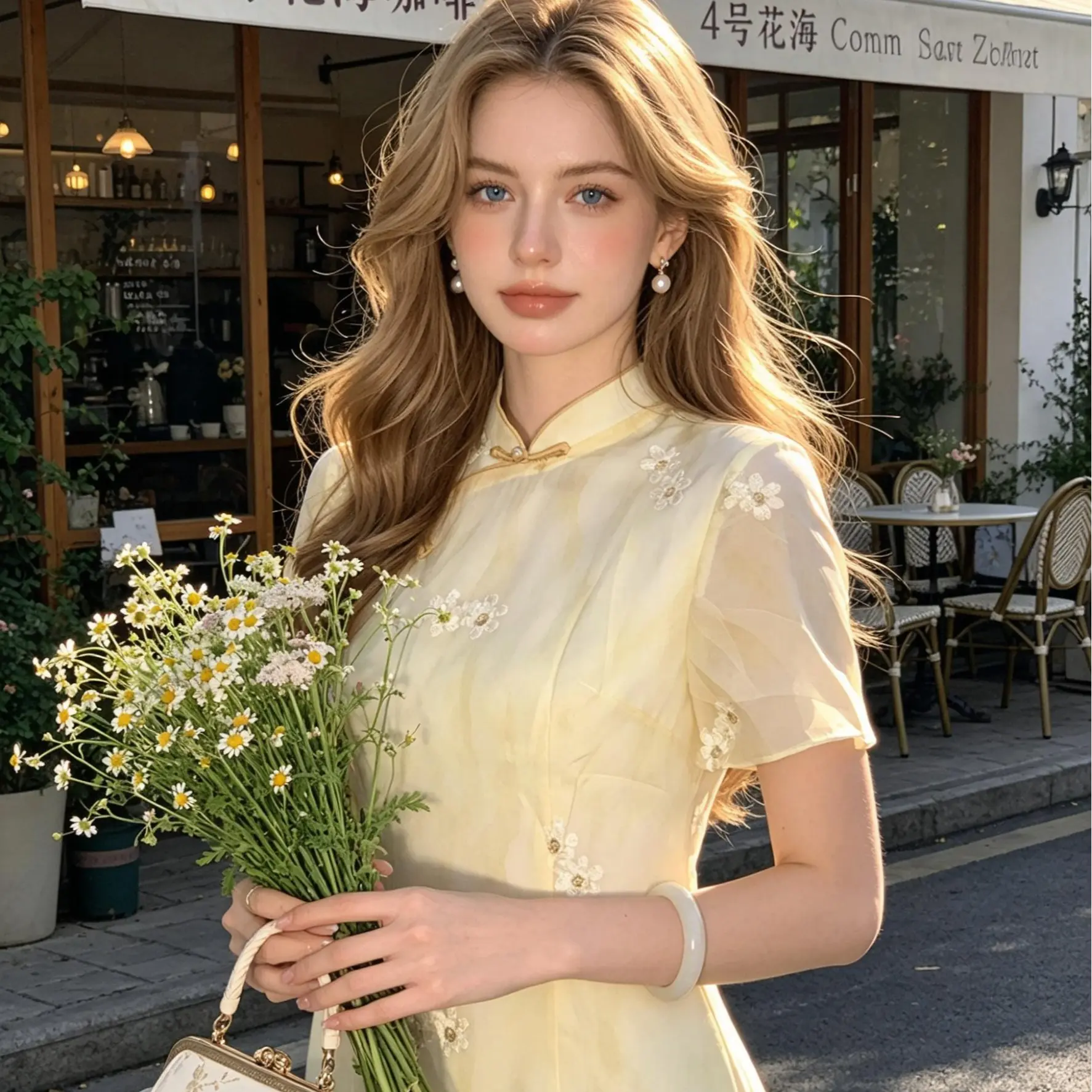 Cream Yellow Daisy Embroidery Ao Dai Style Qipao Double Collar Loose Vacation Dress