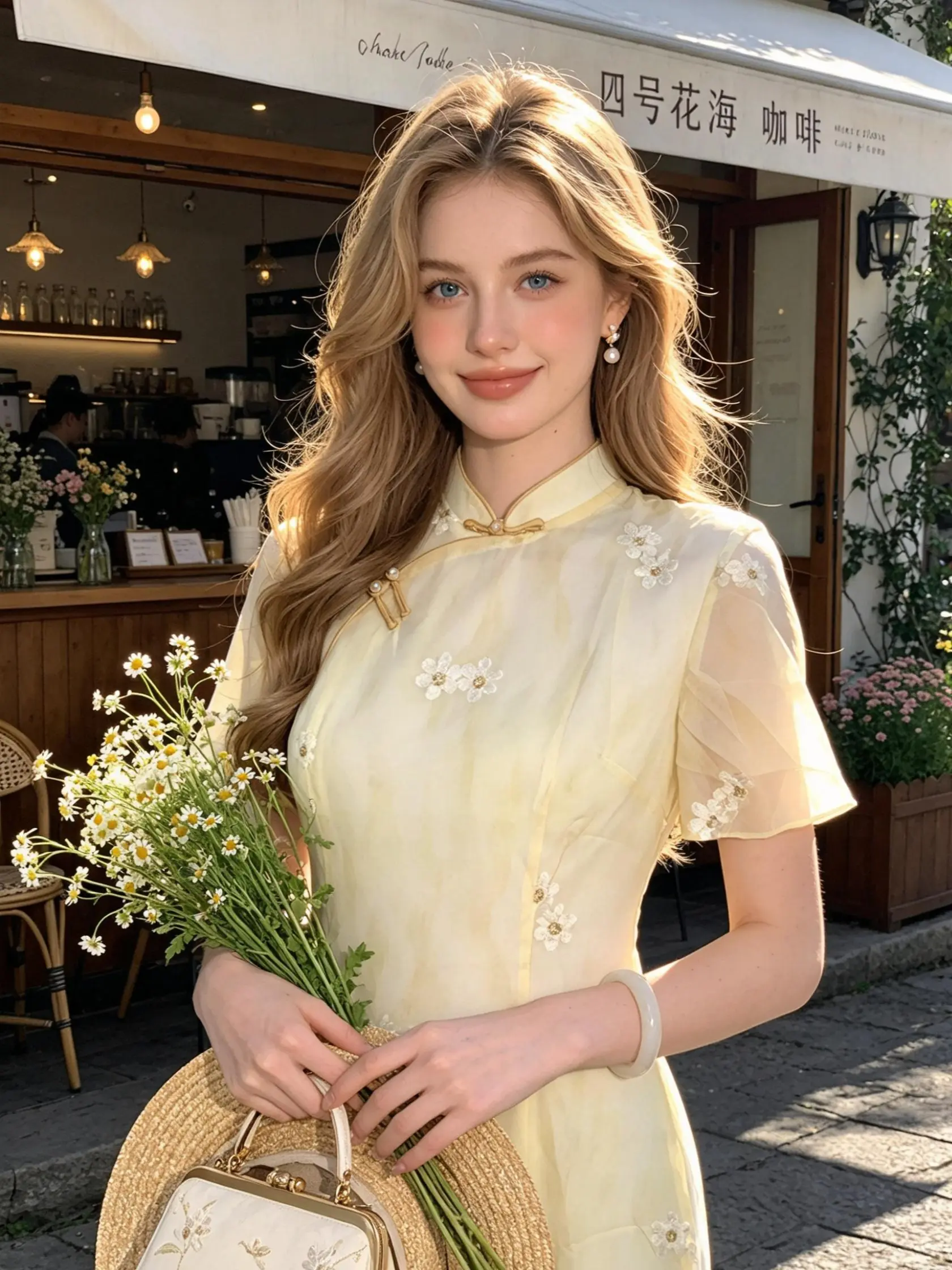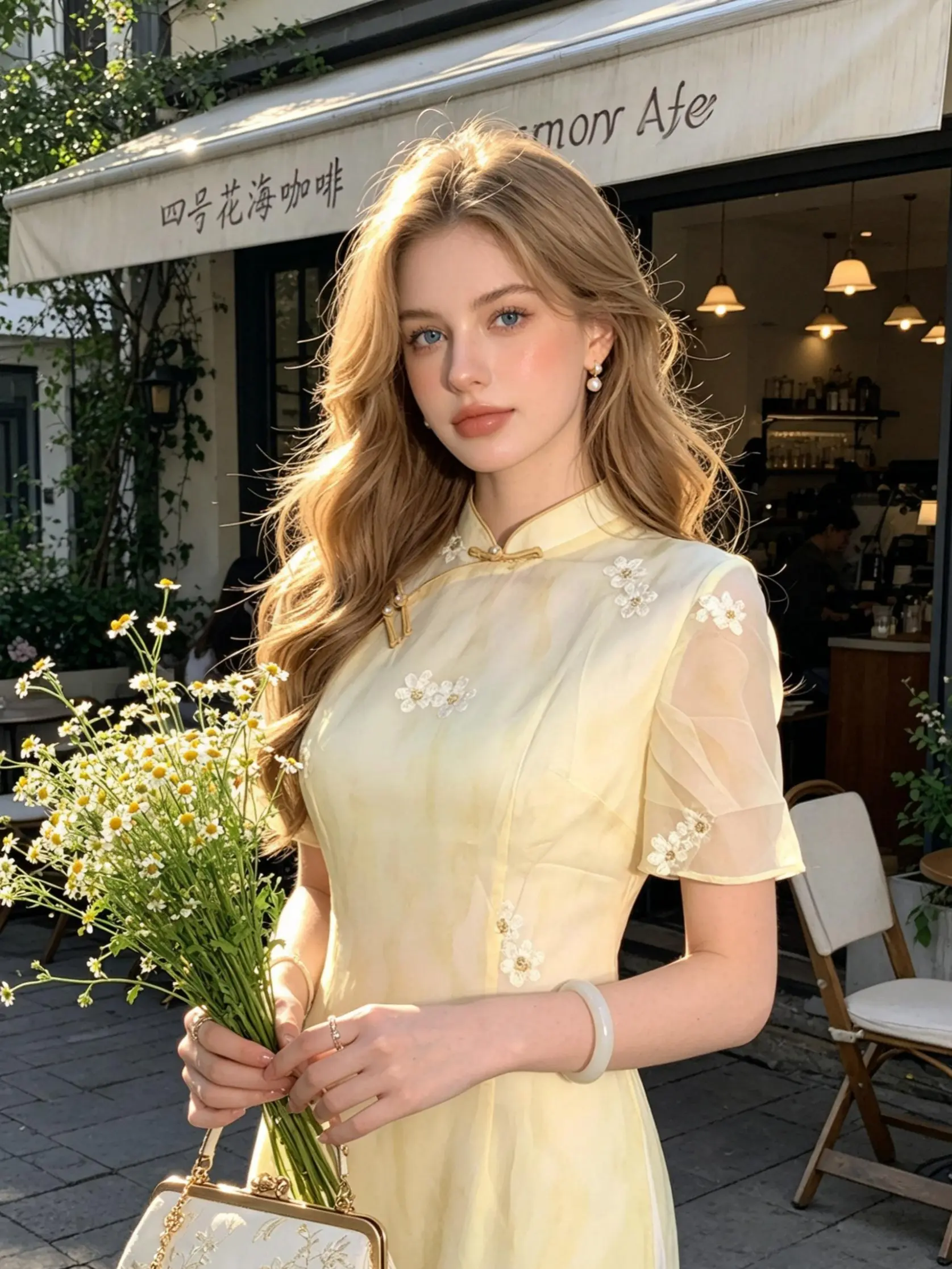 5. Cream Yellow Daisy Embroidery Ao Dai Style Qipao Double Collar Loose Vacation Dress