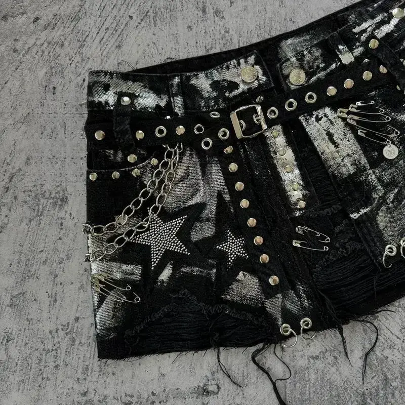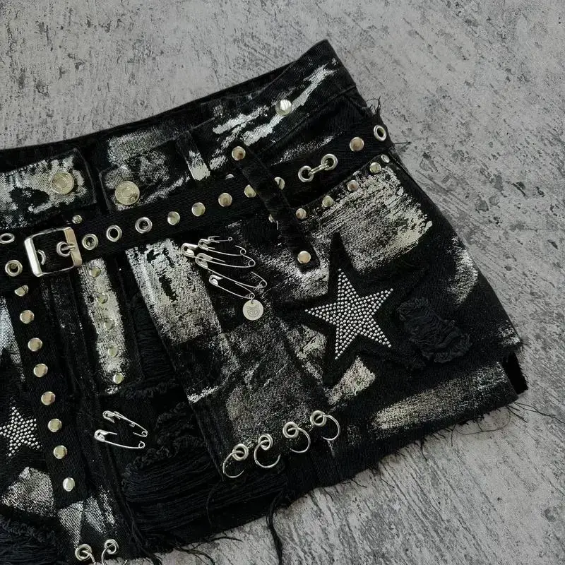 NewGothicRetroBlackDenimSkirtHarajukuStarGraphicRhinestoneRivetMiniSkirtSexyHotGirlSlimLowWaistHipSkirtsRAIMENTRY
