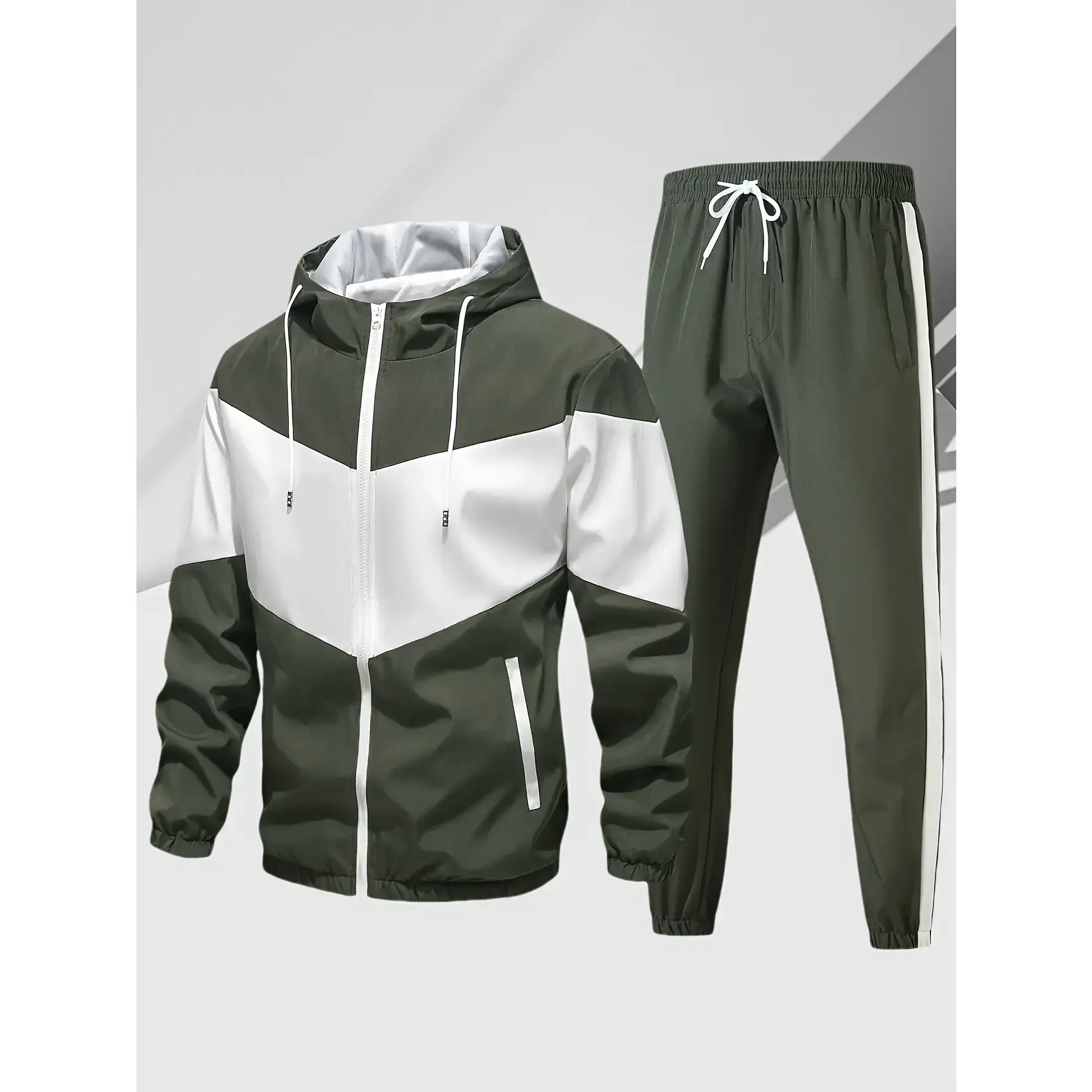 Men's casual two-piece, stylish zip-down hooded jacket, breathable solid color pull-string pants