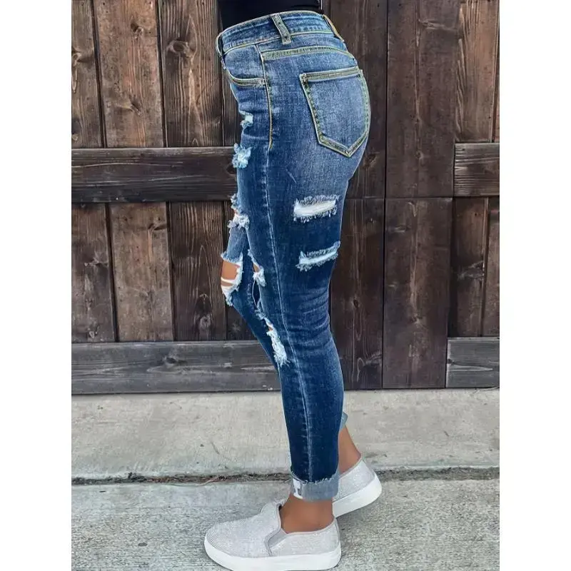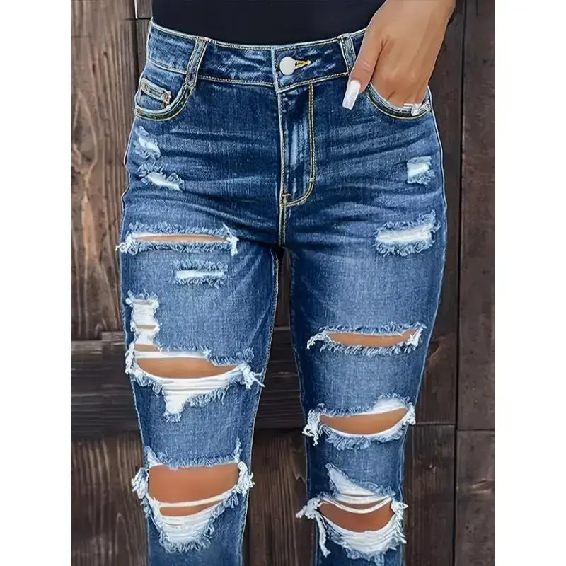 Home Wear Women's Ripped Mid-Waist Boyfriend Style Jeans Loose Fit Vintage Stretch Jeans Blue Women's ClothingRAIMENTRY