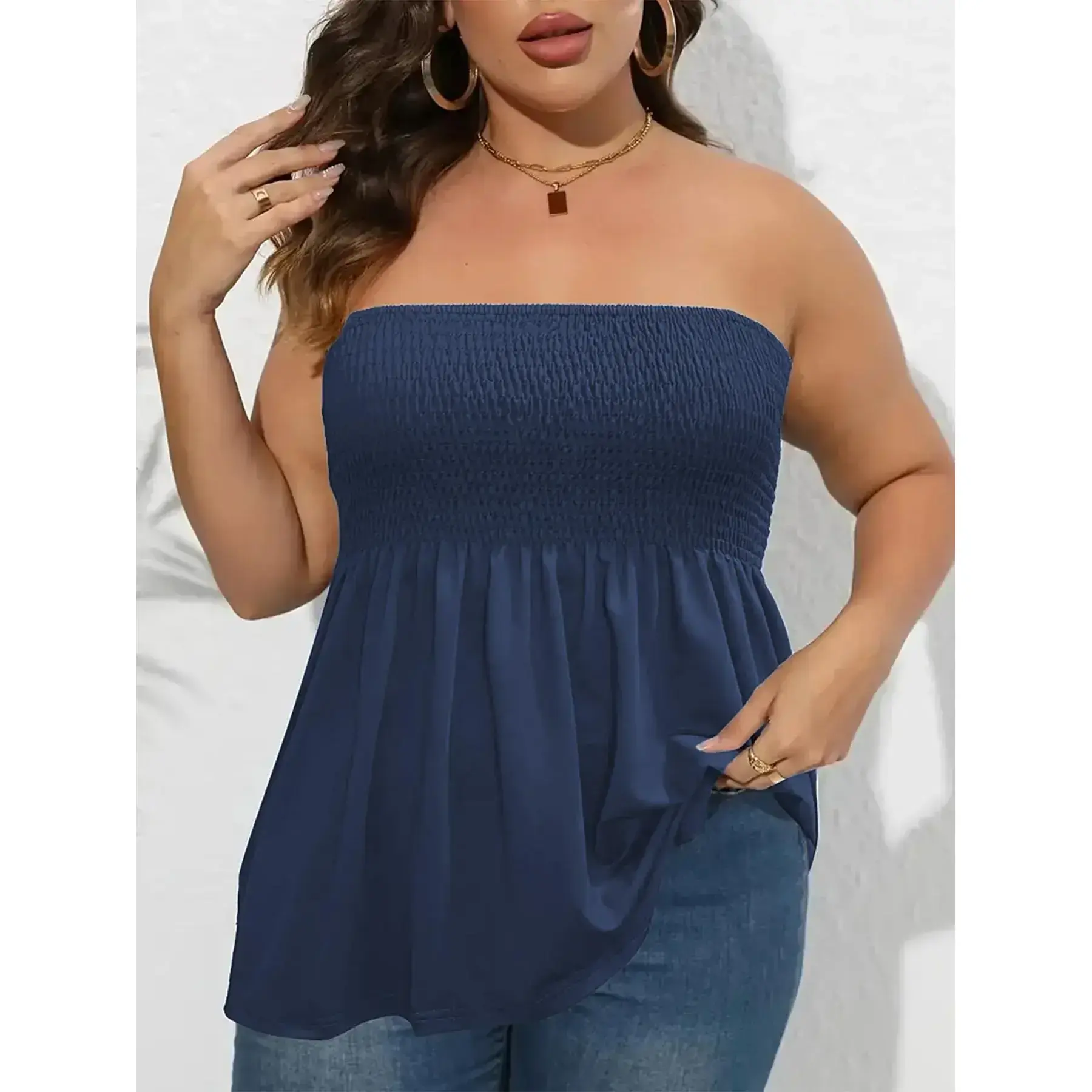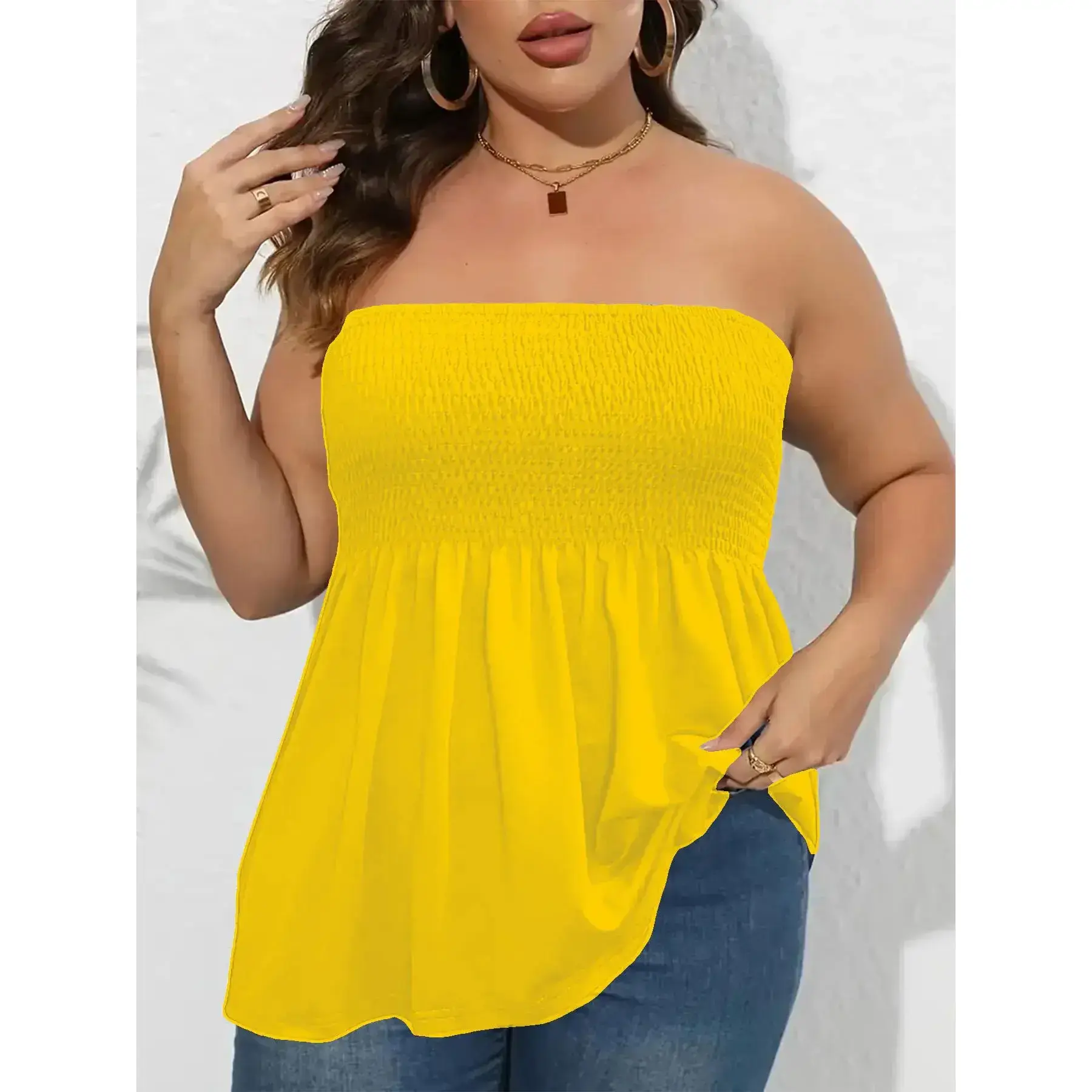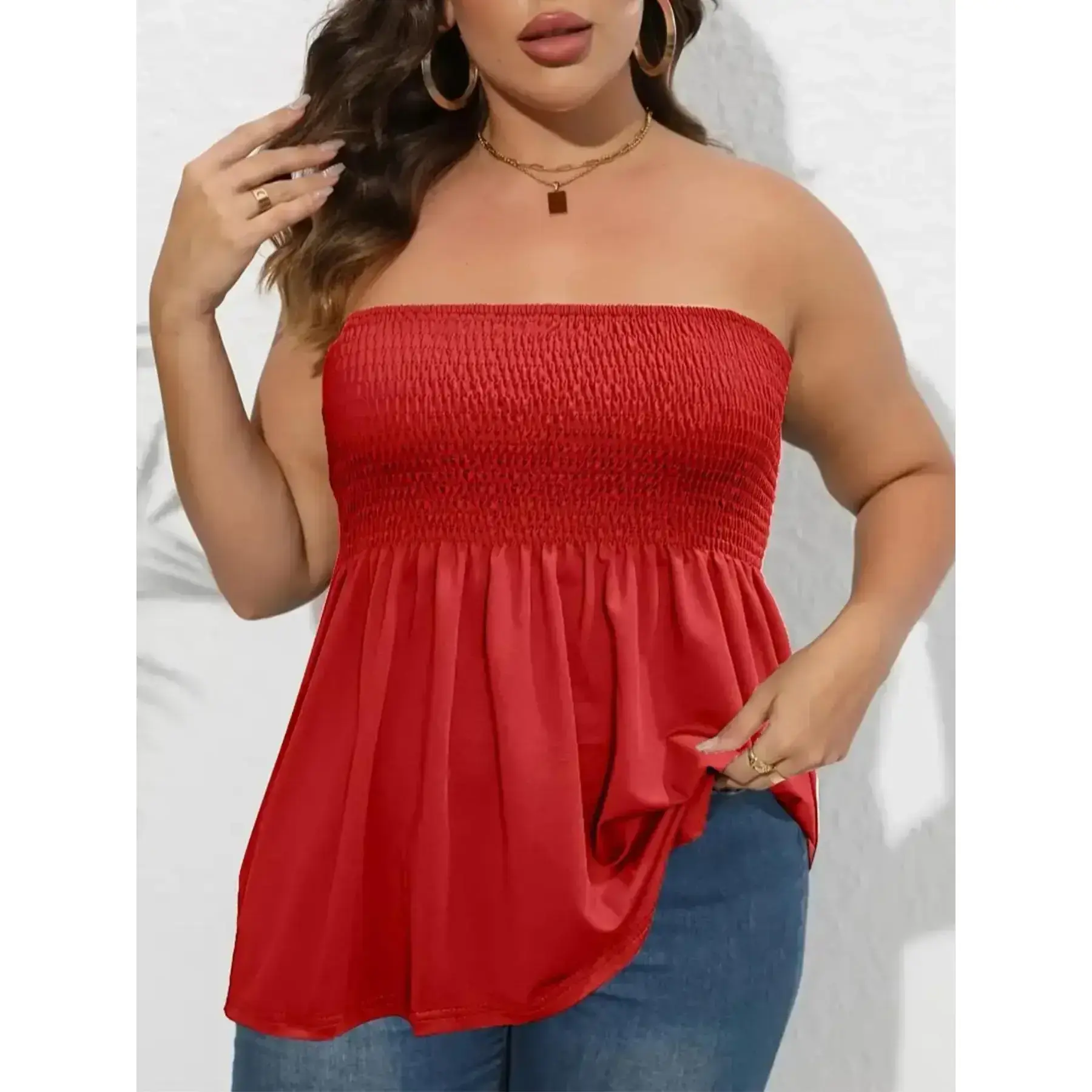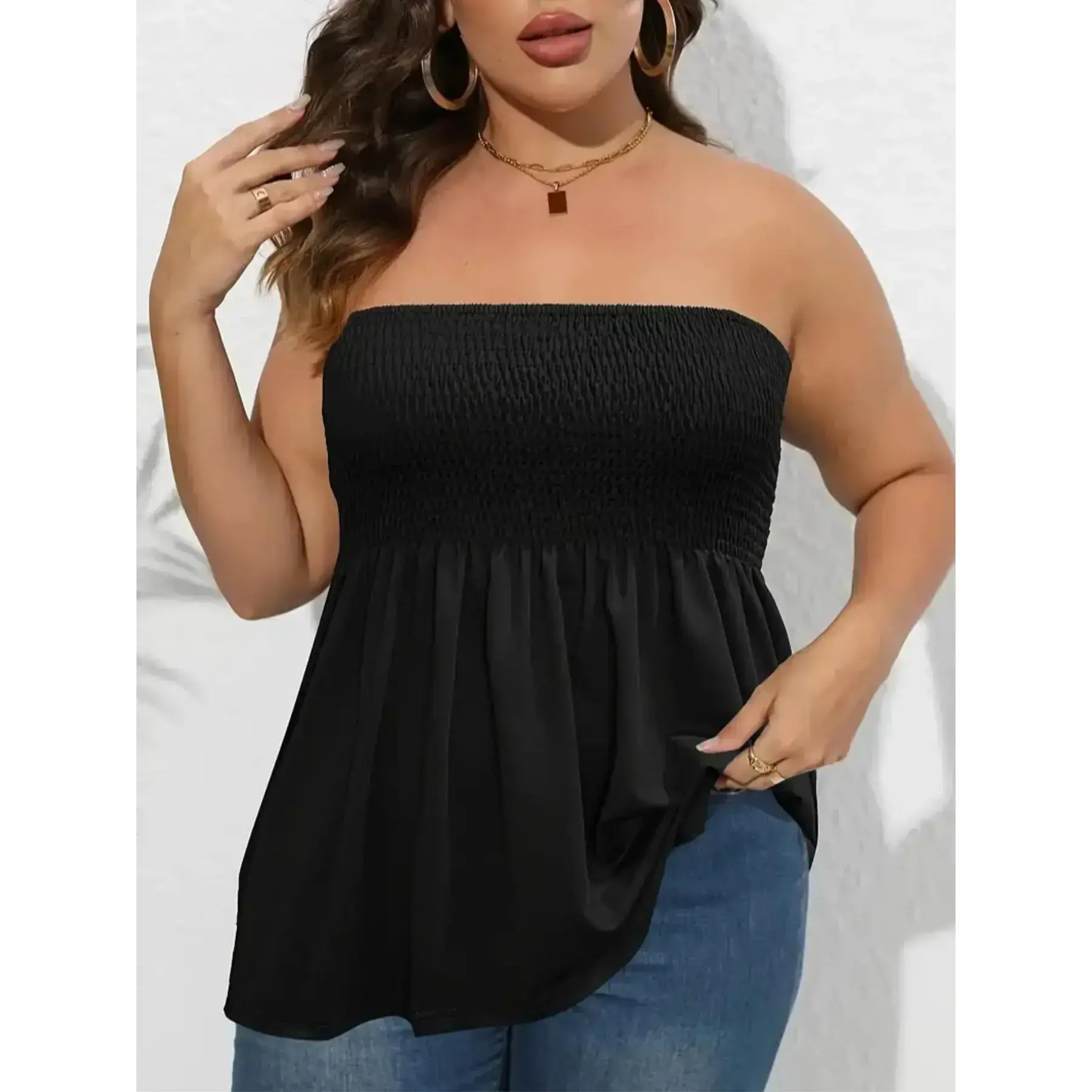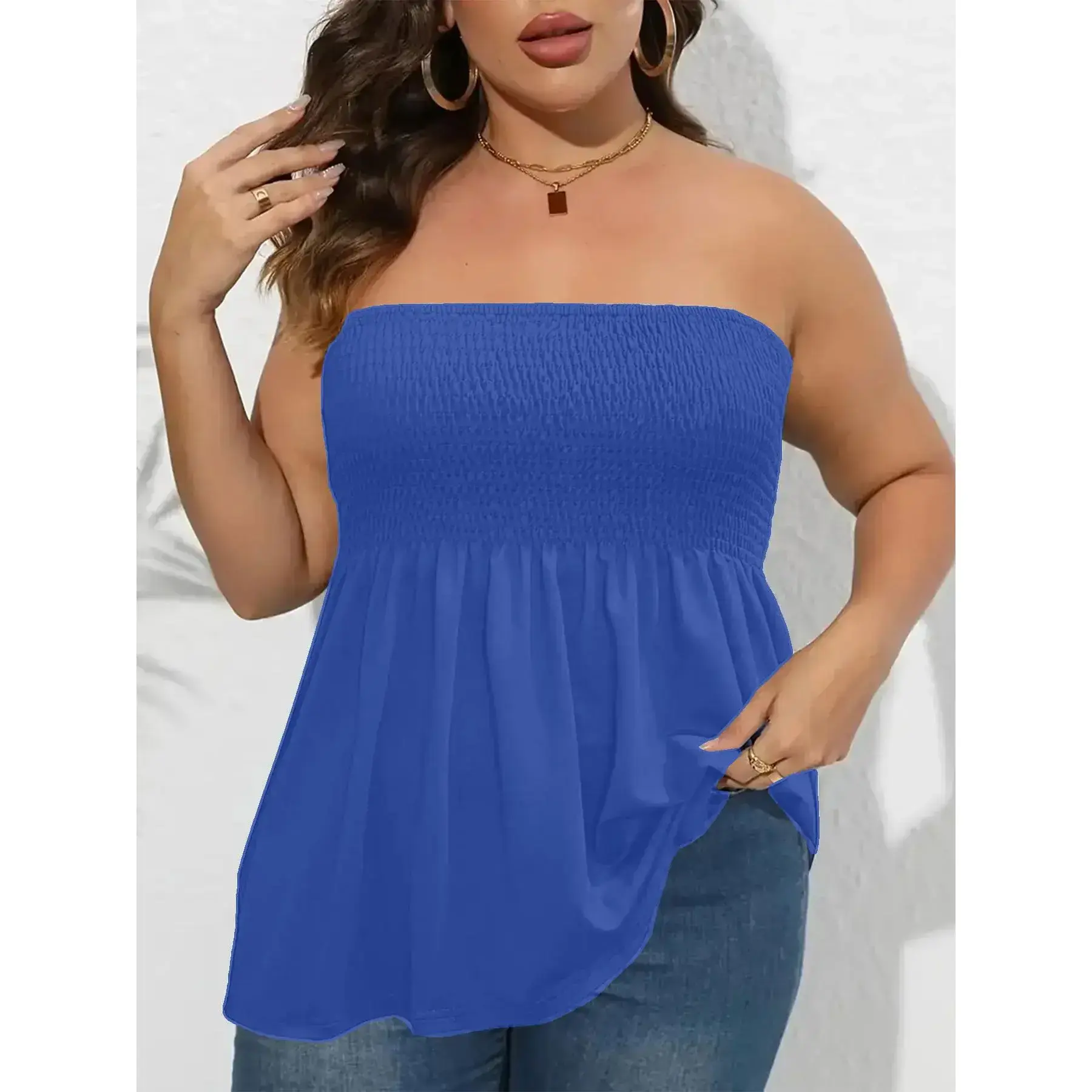 【Easy Care Instructions】: Keep your peplum top looking its best with minimal effort; simply machine wash as per the care instructions to maintain its vibrant color and shape, ensuring lasting wear. 【Boho Chic Style】: Make a bold fashion statement with the boho fashion casual strapless peplum top, featuring a charming ruffle hem and a playful shirred design that adds a touch of whimsy to your daily or holiday vacation wear. 【All-season Wear】: Versatile top that can be worn in any season. 【Versatile Fashion for All Seasons】: Whether you're stepping out for a casual day or dressing up for a holiday event, this strapless peplum top's casual yet elegant style makes it suitable for a variety of occasions throughout all seasons. 【Flattering Plus-Size Fit】: Embrace your curves with the plus size solid ruffle hem shirred tube top, designed with a tight-fitting silhouette and medium stretch for a flattering, body-hugging look that accentuates your plus-size figure.