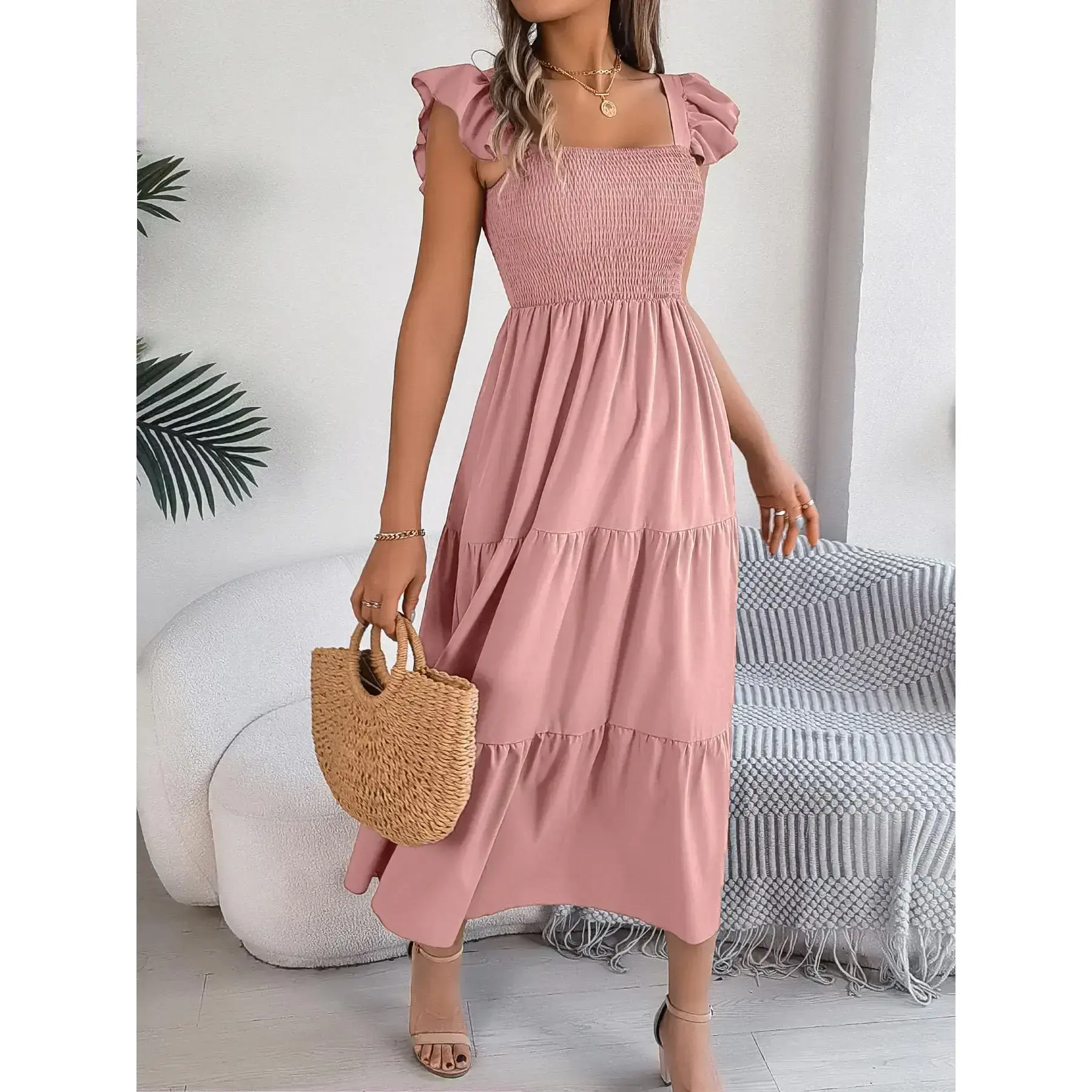 Women's Plain Ruffle Hem Shirred Tiered Layer A Line Dress, Casual Butterfly Sleeve Square Neck Long Dress for Summer, Ladies Clothes for Beach Holiday Vacation, Casual WearRAIMENTRY
