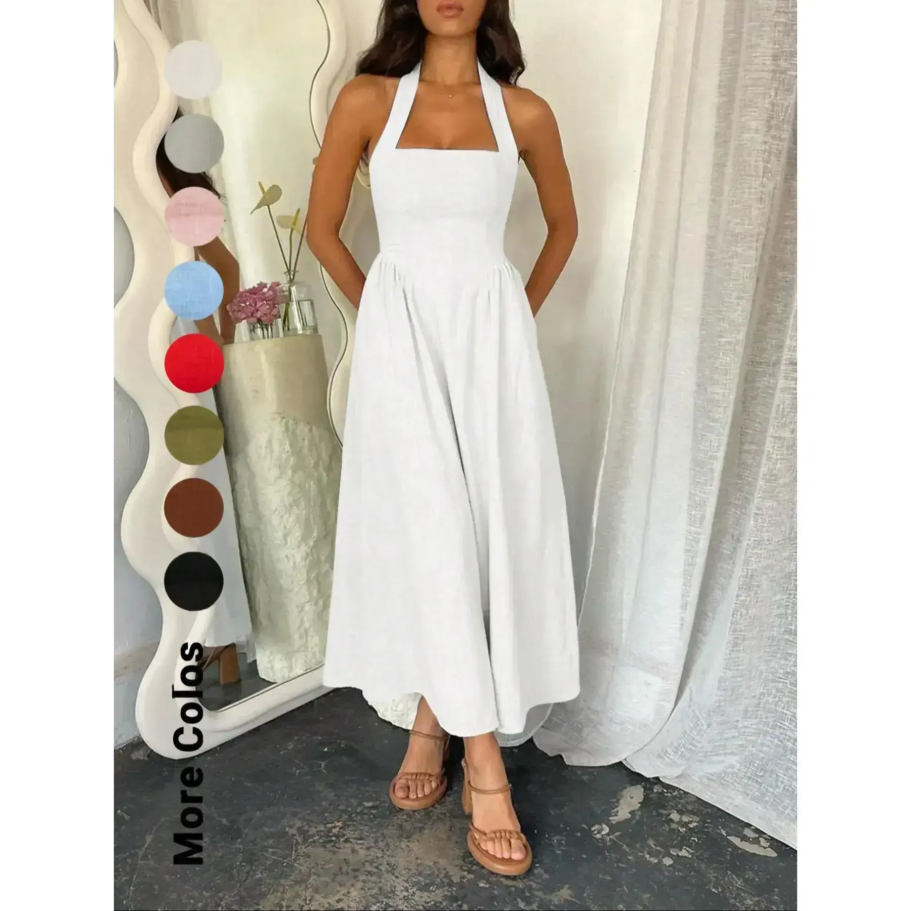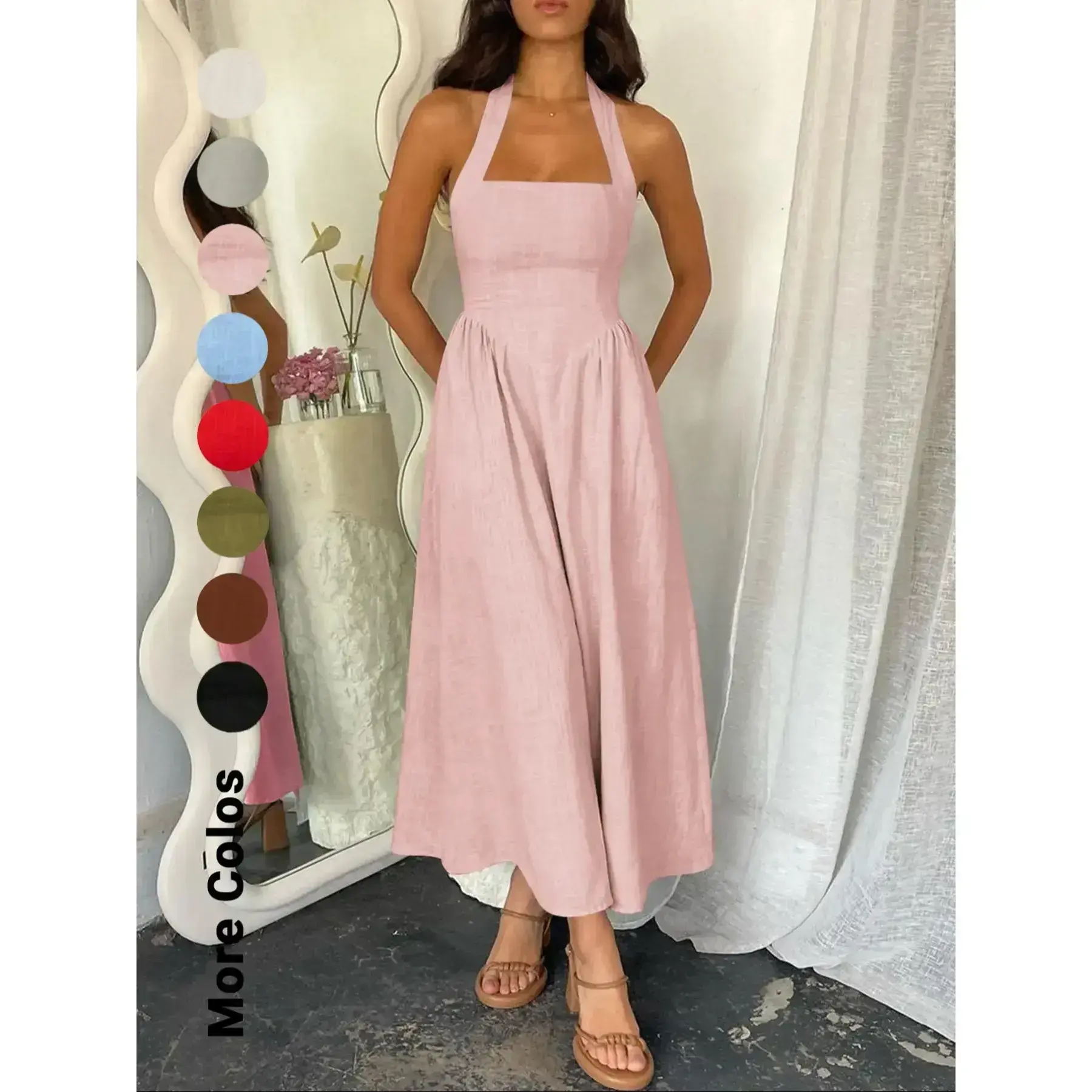 Women's Plain Pocket Zipper Back Dress, Casual Sleeveless Halter Neck A Line Dress for Summer, Ladies Clothes for Beach Holiday, Minimalist Womenswear, Backless Dress, Elegant Sleeveless Dress, Sundress, Brunch Dresses