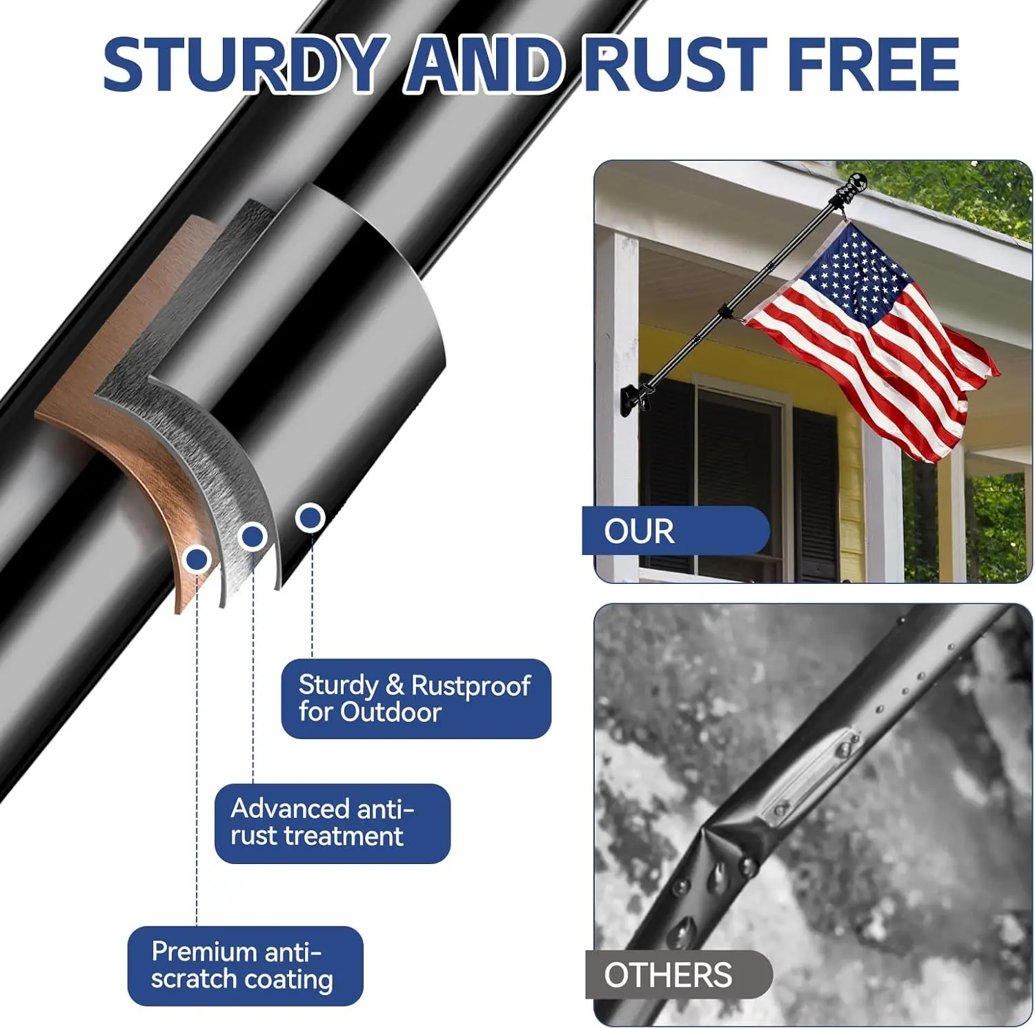 ·Durable and Rust Resistant: This flagpole crafted from heavy-duty stainless steel with advanced anti-rust treatment and anti-scratch coating, this flagpole withstands strong winds, heavy rain, and extreme weather —perfect for long-term outdoor use.