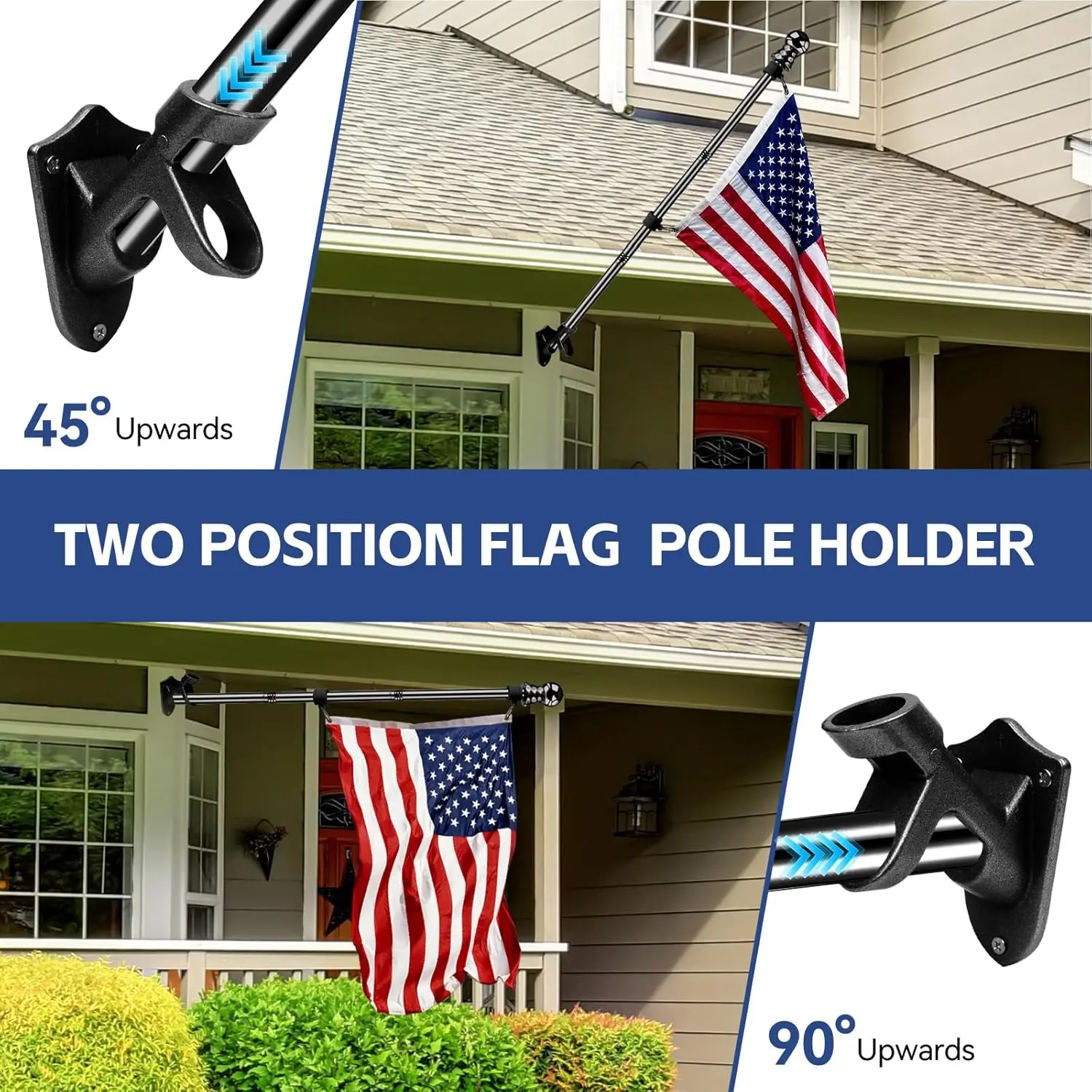 ·Adjustable Flagpole Kit:The adjustable aluminum alloy bracket flagpole kit allows two mounting angles (horizontal or 45° upward), offering flexibility to showcase your flag for holidays (Independence Day, Veterans Day, etc.) or daily decoration of house exteriors, yards, or gardens.