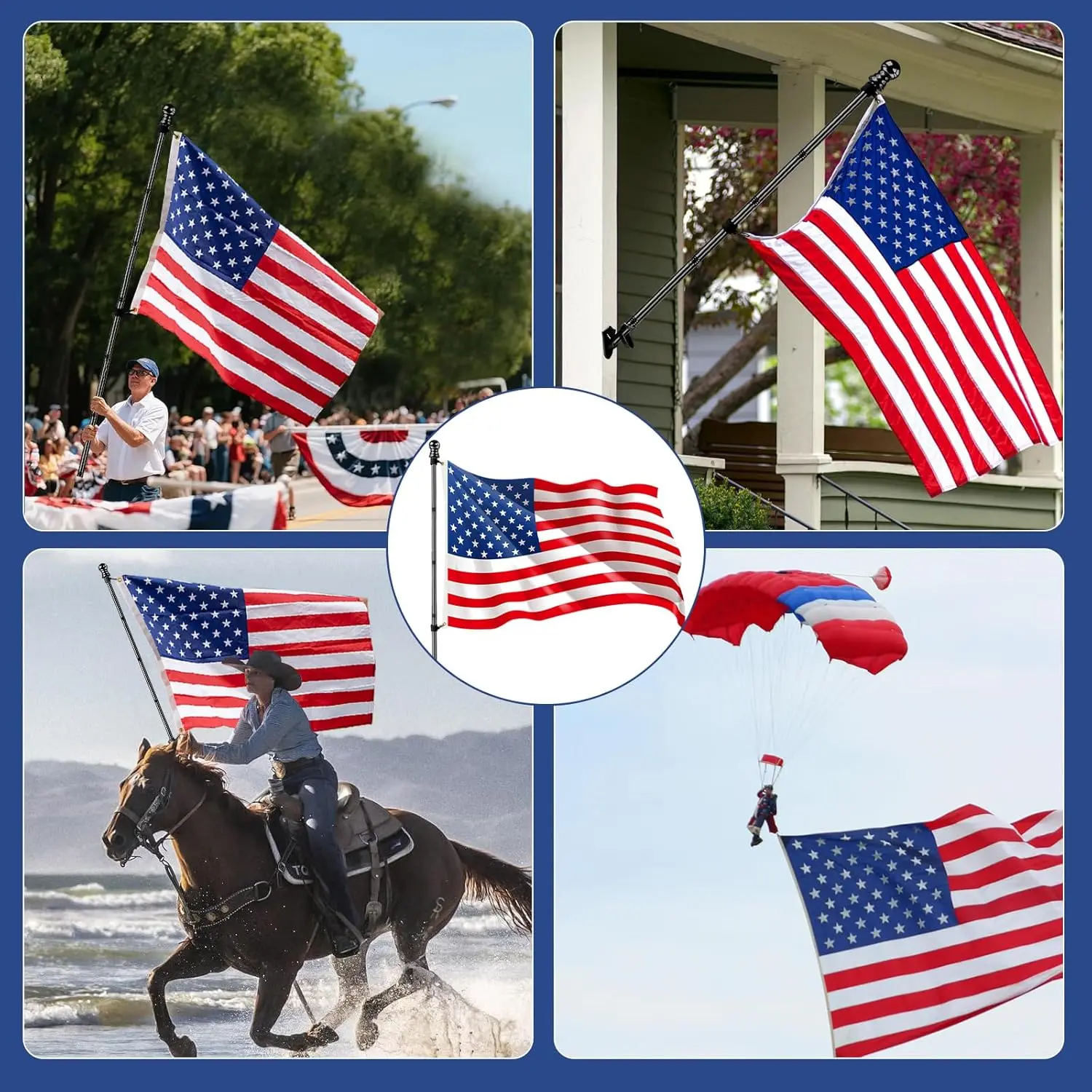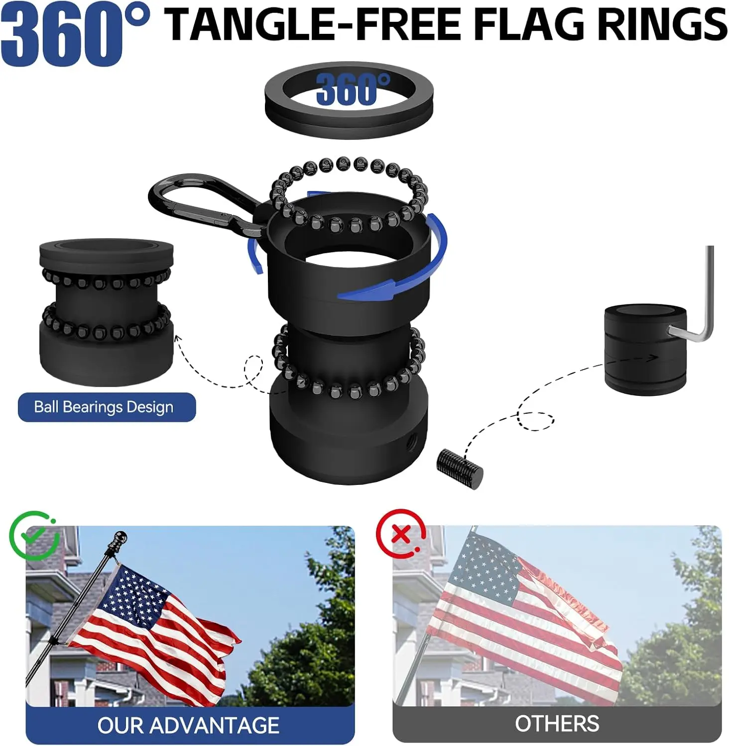 ·Tangle-Free Rotating Rings : Our American Flag with Pole kit with 360° rotatable rings featuring ball bearings, the kit ensures smooth, uninterrupted flag waving. It prevents tangling, twisting, or knotting, keeping your flag flying freely in all directions.