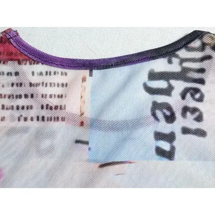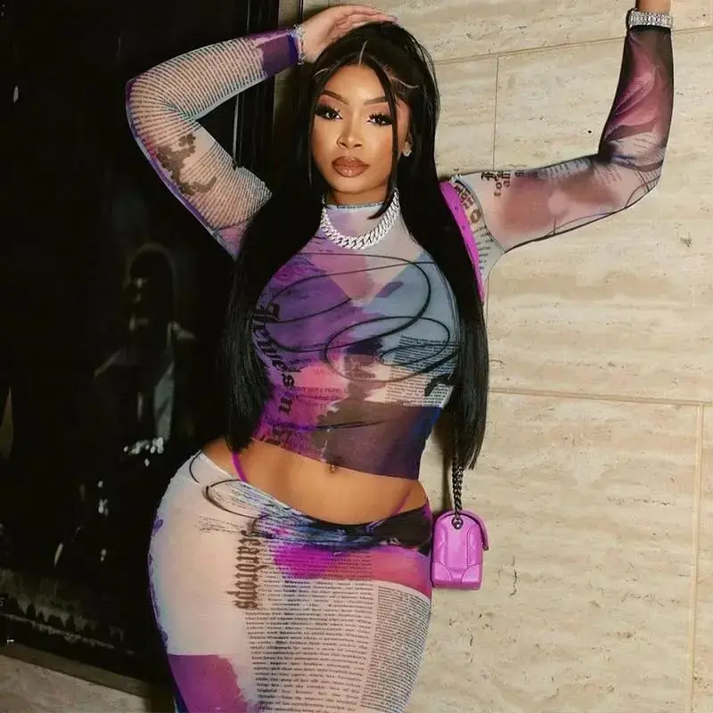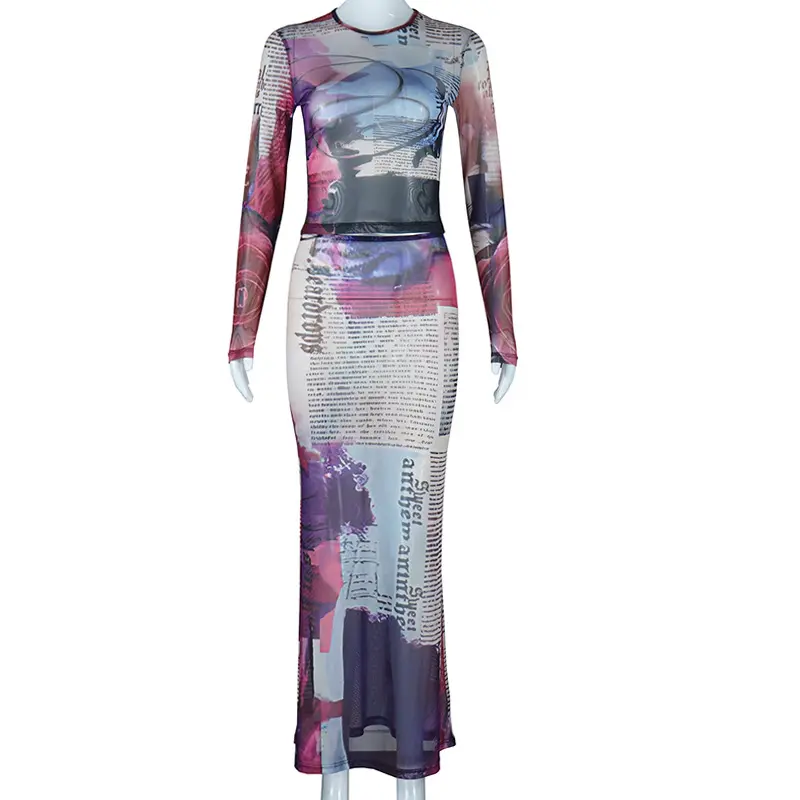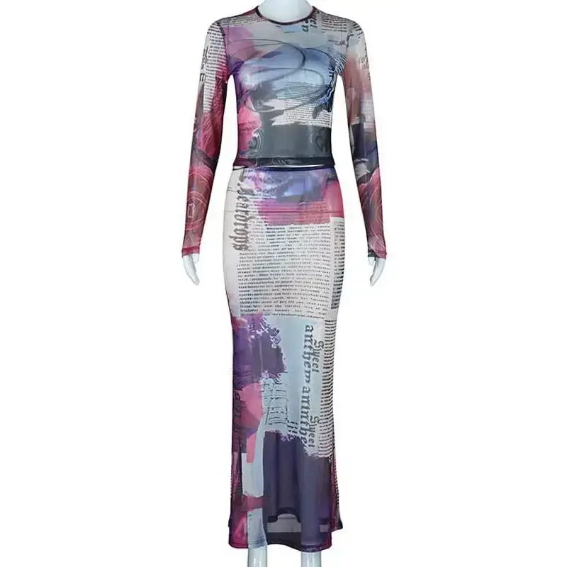 Mesh fabric construction delivers a lightweight breathable feel ideal for nightclubs and events Bold newspaper print and abstract overlay combine for a striking artistic fashion statement Matching set includes a long sleeve crop top and a high waist sheer maxi skirt for coordinated styling Stretch bodycon fit hugs curves enhancing silhouette while ensuring all-day comfort Pull-on elastic waist and soft mesh material allow ease of movement for parties and special gatherings