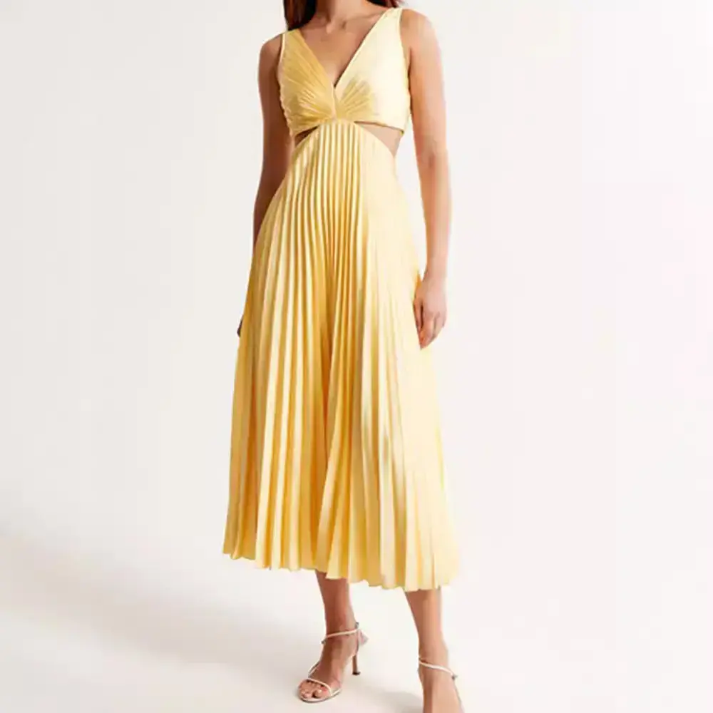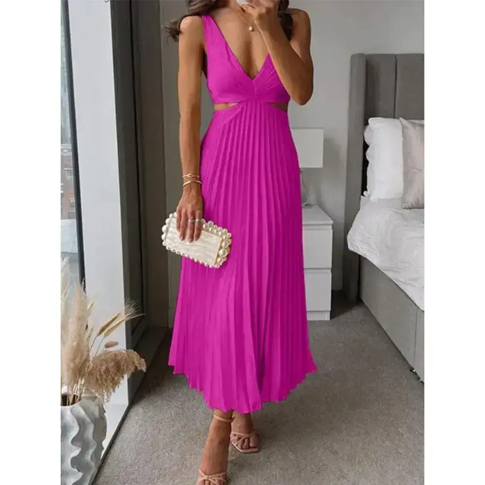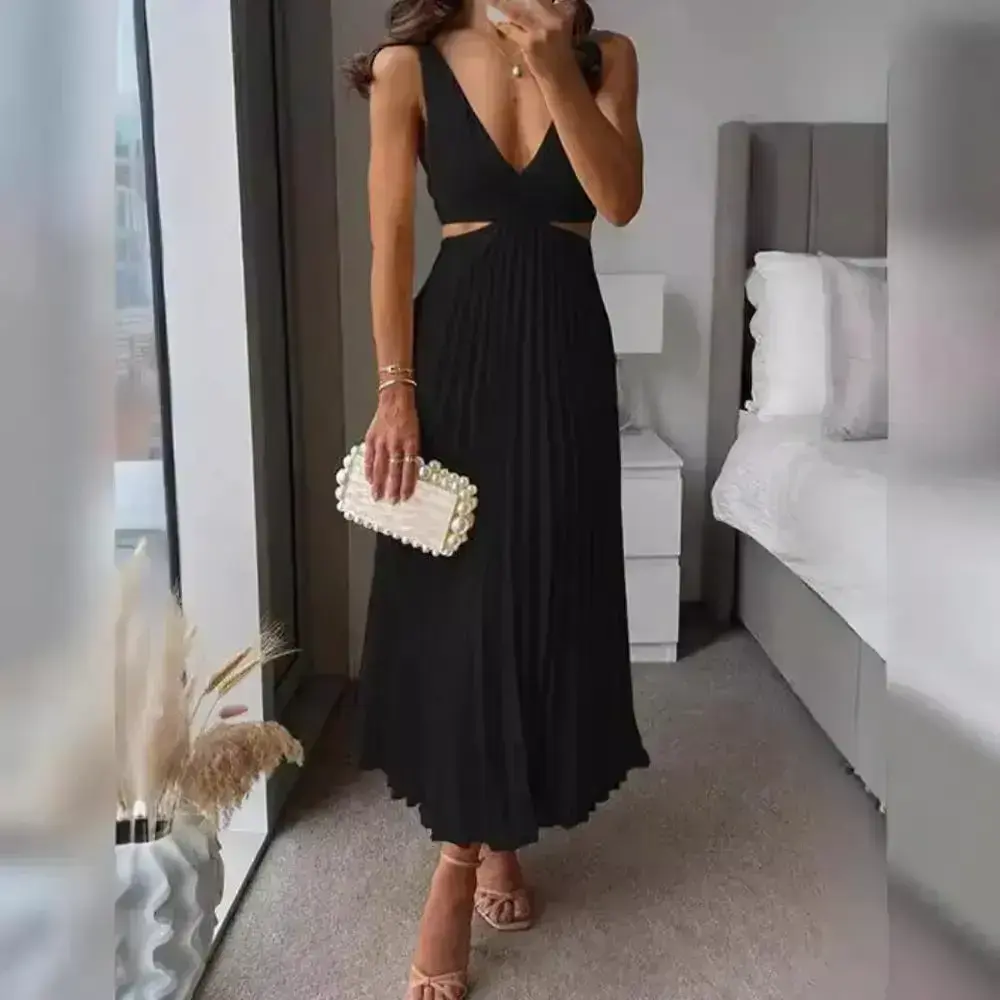 2025 Summer New Elegant V-neck Sleeveless Hollow Out Backless Pleated Dress Formal Womenswear