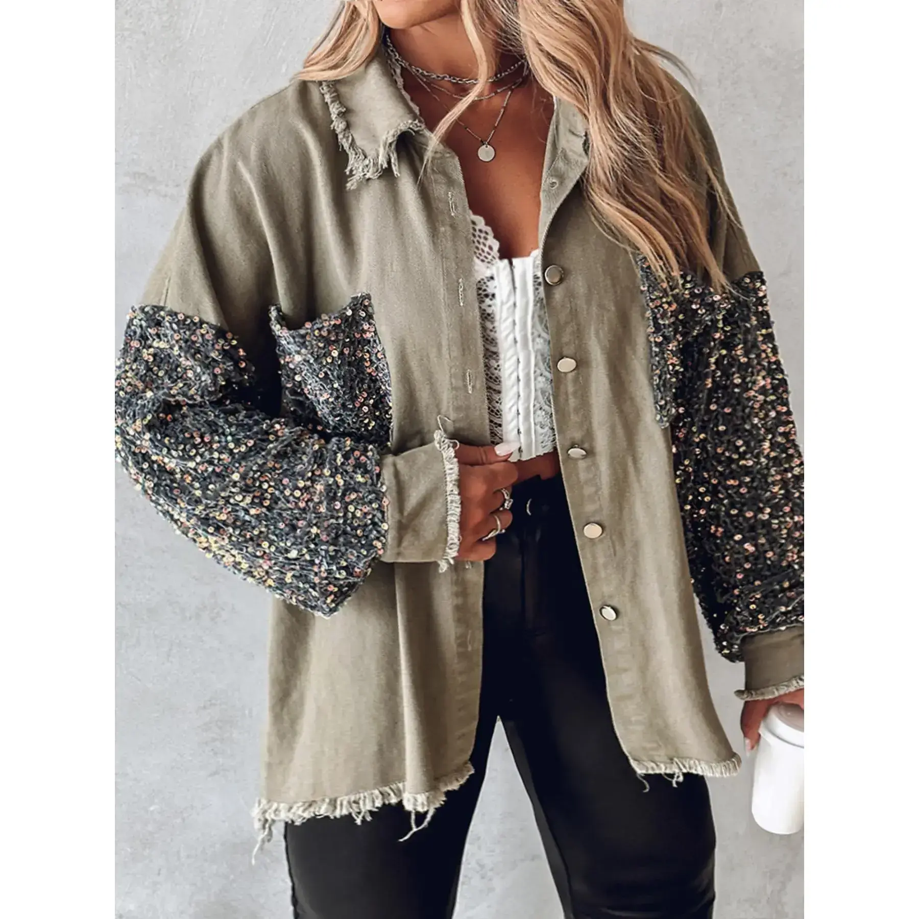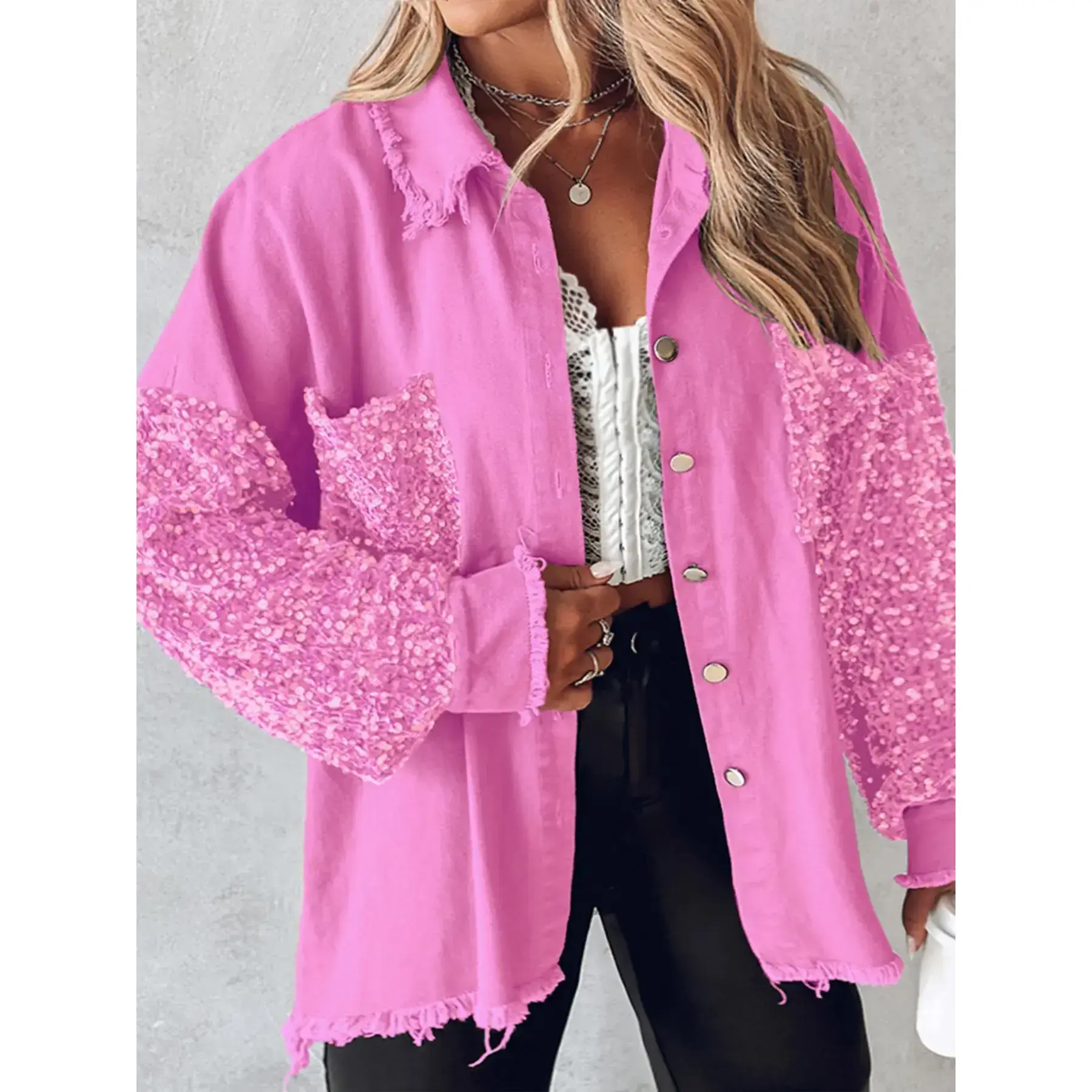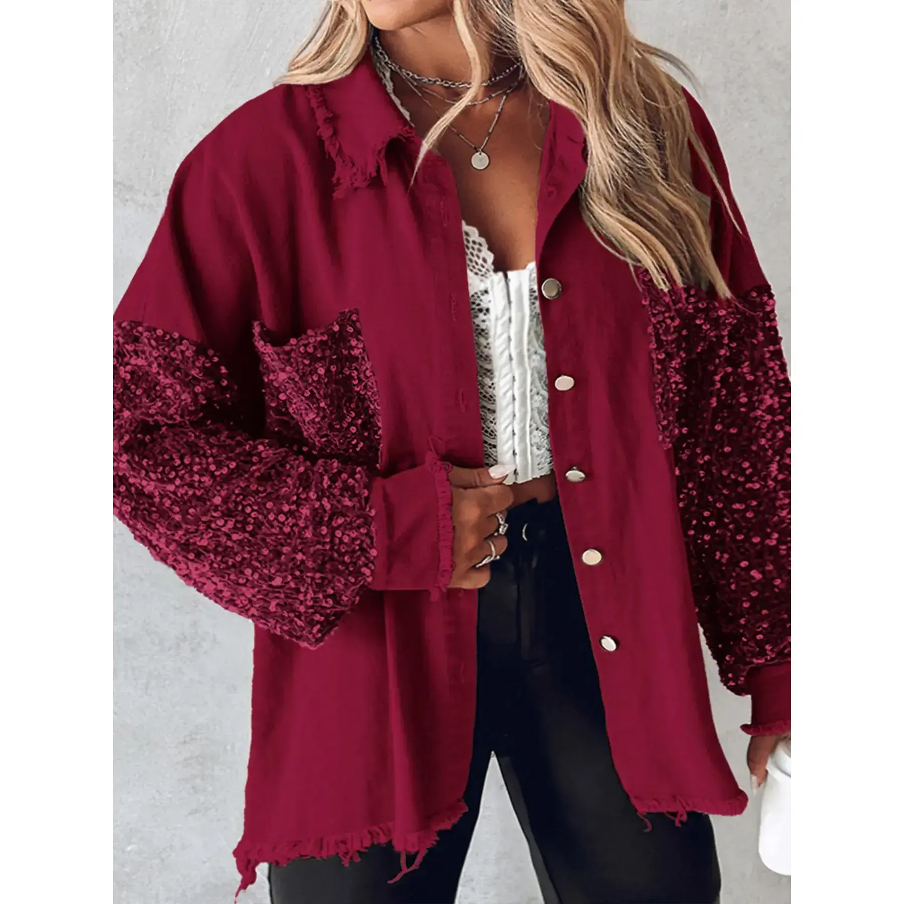 【Eye-catching details】: The contrast sequin accents add a touch of sparkle and flair, making it stand out among typical fall and winter outerwear options. 【Practical pockets】: Equipped with pockets, this shirt jacket offers functional storage for essentials, enhancing utility for daily wear without compromising on looks. 【Raw hem finish】: The raw hem adds a trendy edge to the classic button-up, creating a unique look that sets this piece apart from standard jackets. 【Drop shoulder sleeves】: Featuring drop shoulder sleeves for a relaxed fit, this shirt jacket allows for easy layering and promotes unrestricted arm movement. 【Fitted silhouette】: The fitted shape offers a tailored look that flatters various body types, ensuring a polished appearance while maintaining a modern appeal.