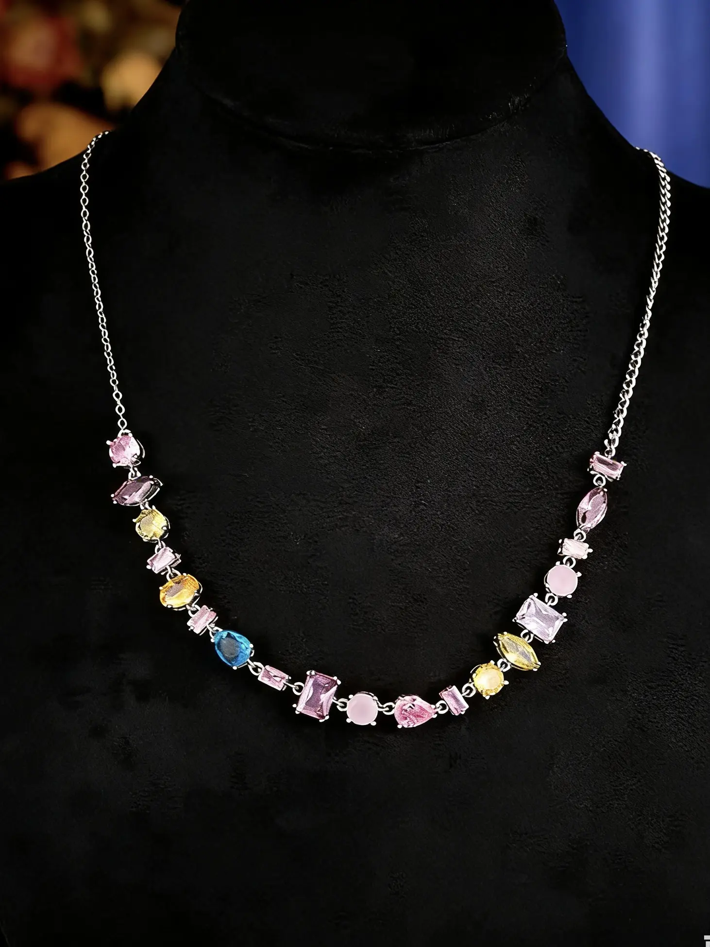 Must-have for sweet girls! Dopamine colorful CZ necklace Mixed-cut CZs in pink, blue and yellow, eye-catching color clash. Alloy silver-plated chain, skin-friendly & comfortable, fits clavicle perfectly.Sweet-cool style, suitable for daily, date & party. Elevate your outfit instantly, perfect for self-use or gifting!