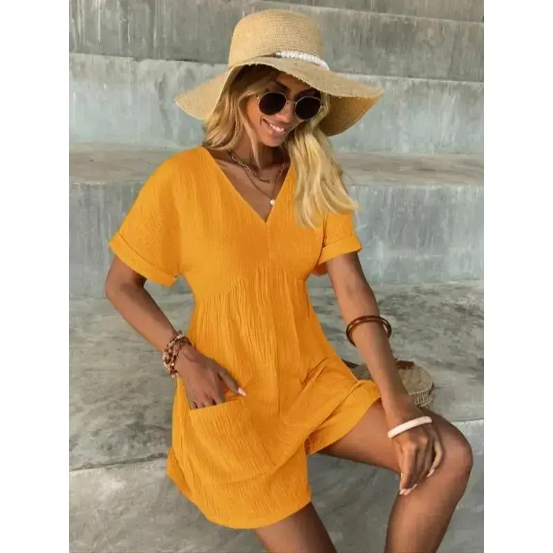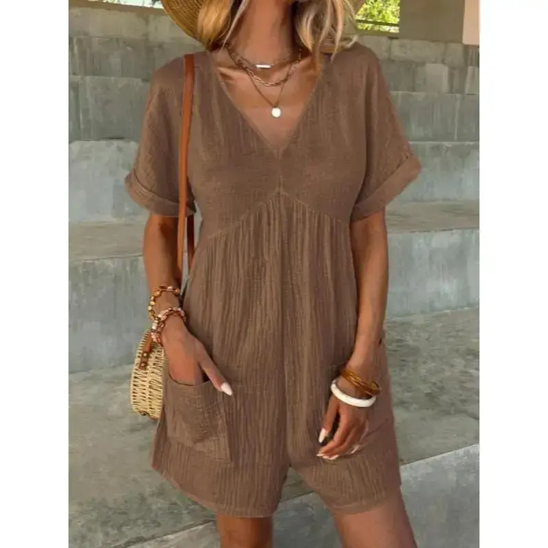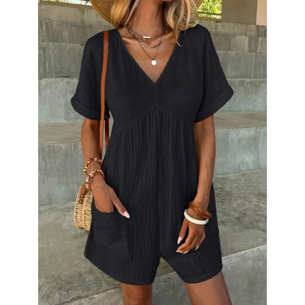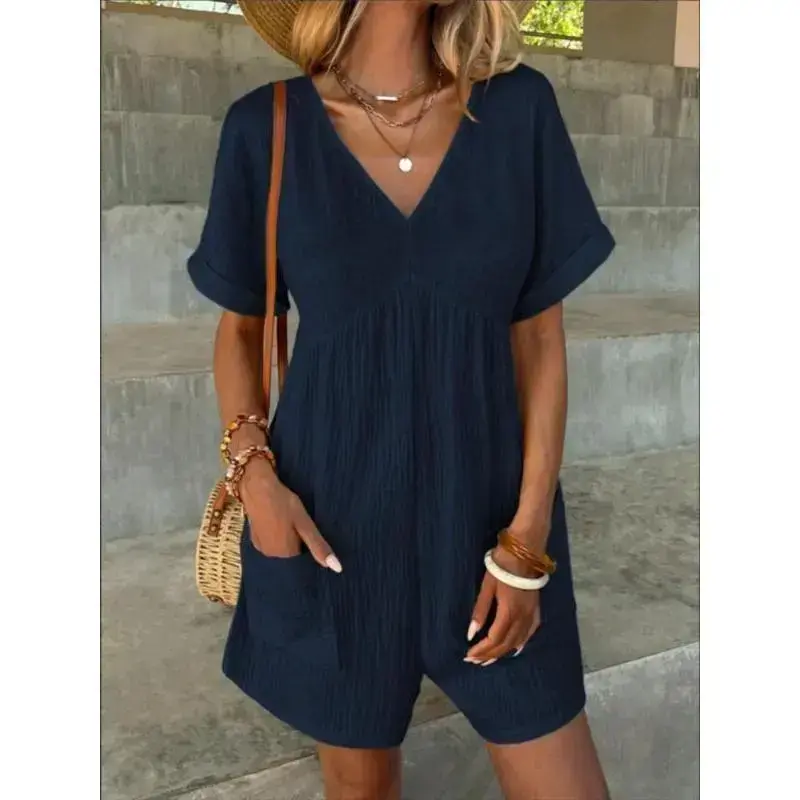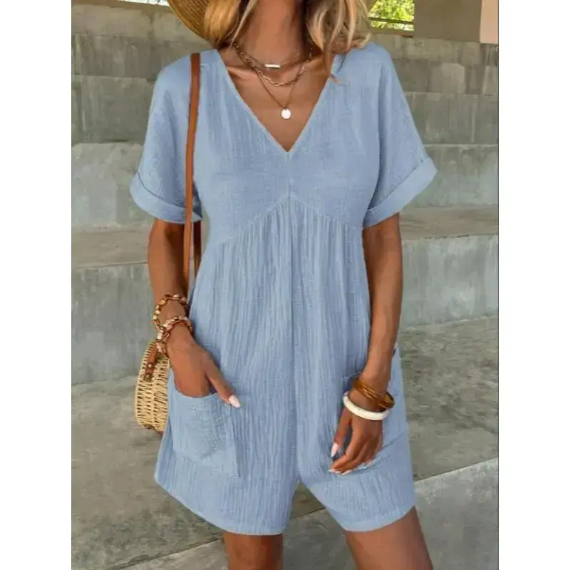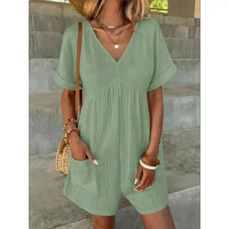 Women's Solid Color V Neck Romper ✨ Elevate your wardrobe with our Women's Solid Color V Neck Romper! This casual, comfy romper is perfect for spring and fall. Available in a vibrant array of colors including Mint Green, Light Blue, Black, Yellow, Brown, Green, Pastel Blue, Royal Blue, Purple, Dusty Blue, Turquoise Blue, Wine Red, Baby Pink, and Coral Pink. Choose your favorite hue to match your style. 📏 Select your perfect fit from our available sizes: S, M, L, and XL. This romper is designed for daily wear, ensuring both comfort and style. Whether you prefer a snug fit or a more relaxed silhouette, there's a size for you. Versatile and Stylish 🌟 This romper is versatile and suitable for various occasions. Whether you're running errands or meeting friends, this romper offers the perfect blend of comfort and style. Update your wardrobe with this essential piece today!