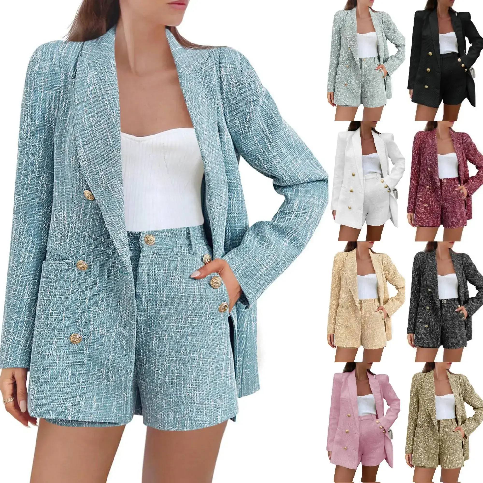 Women's two-piece coarse wool top shorts set long sleeved double breasted suit jacket suit fabric formal wear