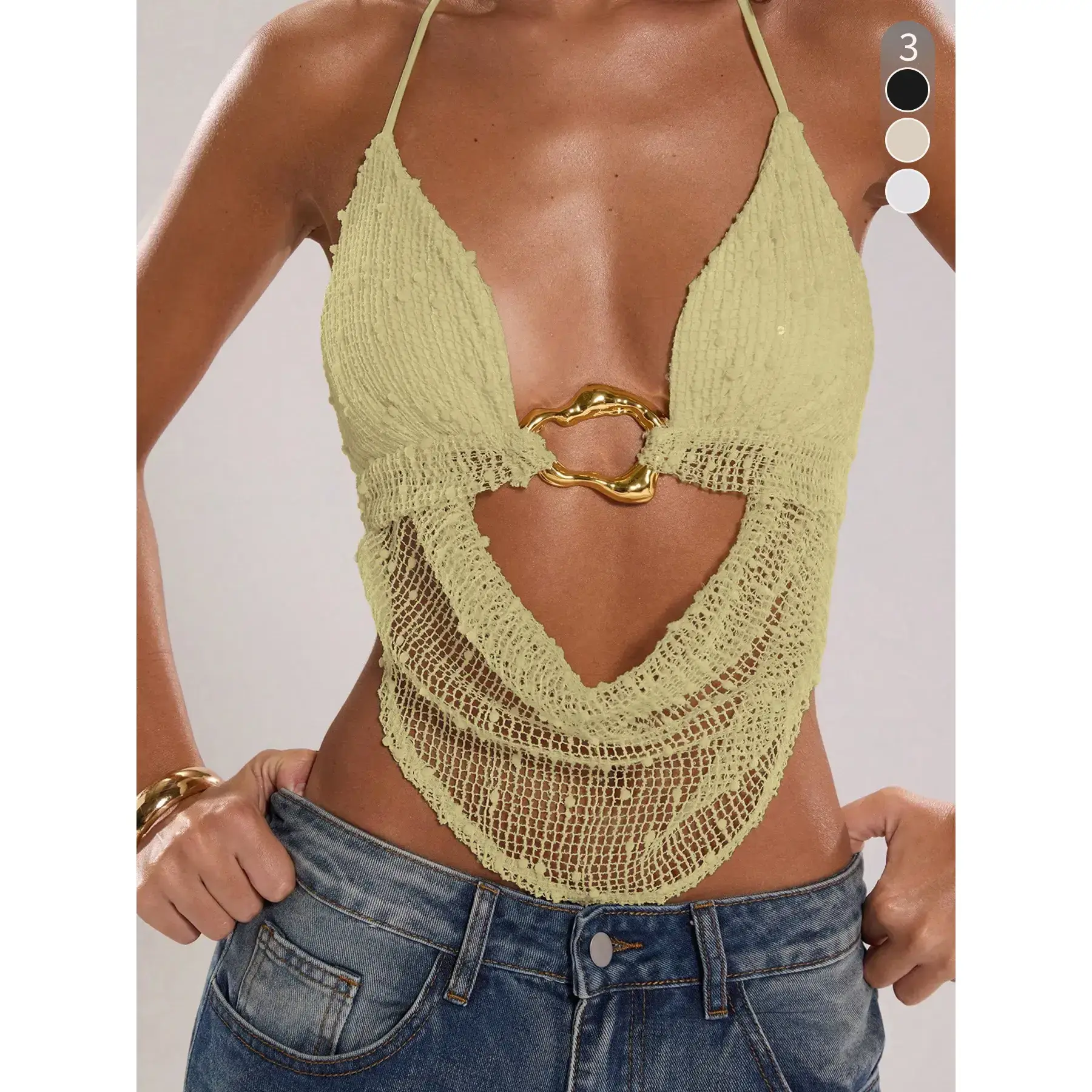 Women's solid color metal decorative crop top, women's fashionable casual deep V-neck ribbed crop top, suitable for daily outdoor wear, summer women's clothing, women's clothing