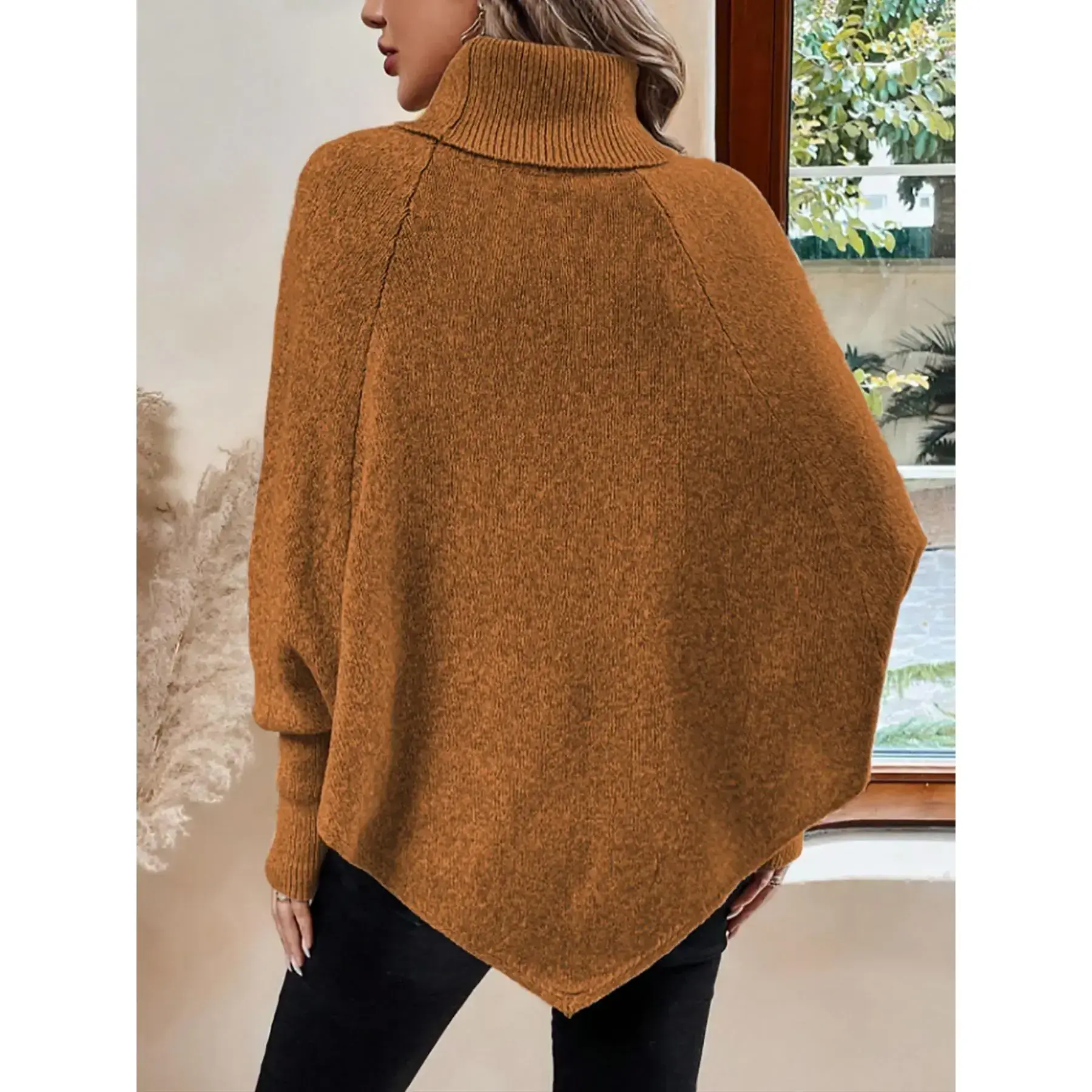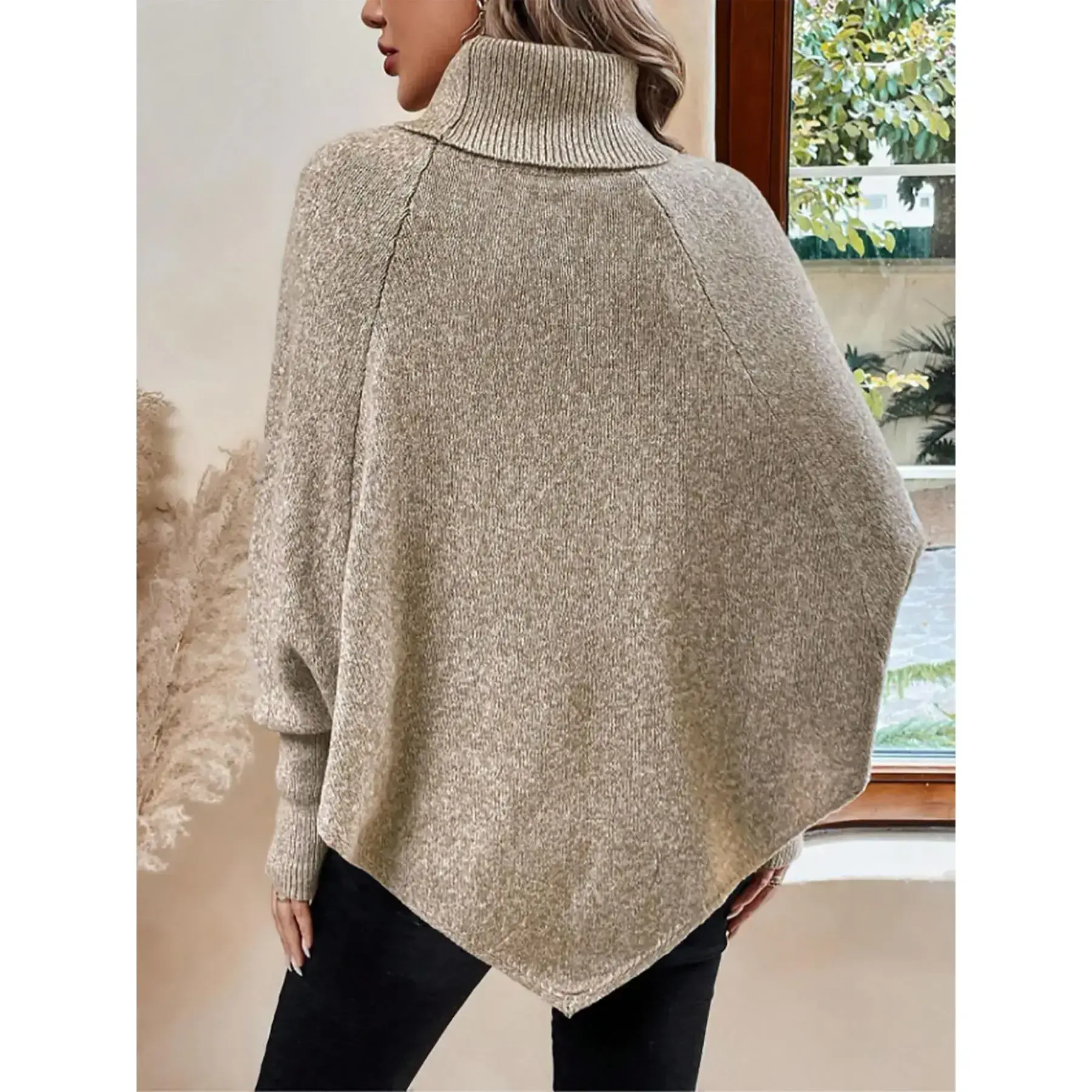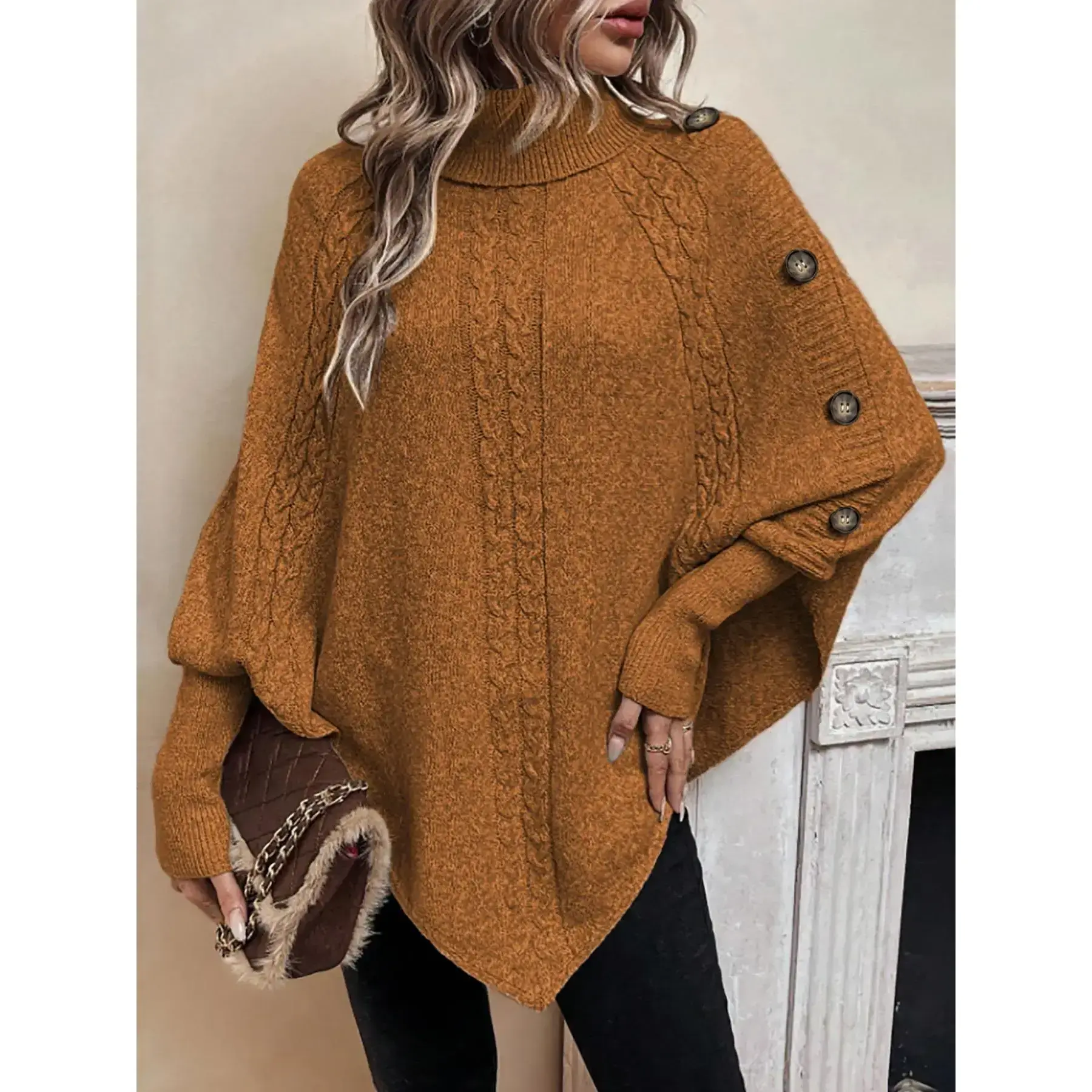 【Unique Button Feature】: This sweater showcases fake button details, lending a touch of originality that distinguishes it from typical pullovers on the market. 【Batwing Sleeve Style】: The batwing sleeve construction offers a striking silhouette, enhancing freedom of movement while maintaining a chic appearance for various occasions. 【High Neck Coverage】: Designed with a high neckline, this jumper provides extra warmth and protection against chilly fall and winter winds, ensuring comfort during colder months. 【Medium Stretch Fabric】: Crafted from medium stretch material, this knitwear fits well without losing shape, combining practicality with a flattering loose fit for daily wear. 【Classic Plain Pattern】: Featuring a plain pattern, this versatile piece can effortlessly complement any outfit, making it an essential addition for an effortless look.