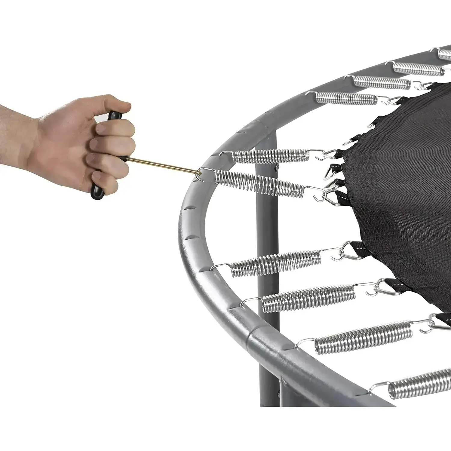 From the manufacturer The tool is constructed from rugged materials so that it remains effective and endures much use. Spring Pull Tool Small and Handy This tool is a must have for anyone who owns a trampoline. It allows you to get the springs into the trampoline frame quickly and easily when setting up your trampoline. Having more than one tool makes it even easier, faster and better when you set up your trampoline mat! Two people can work faster together and achieve the perfect tension in the trampoline jumping mat by working opposite each other. Long and Wide For ultimate strength and leverage. Strong Metal Hook End For efficient and effective use. Plastic Handle with Finger Grooves For comfort, support, and a strong grip.