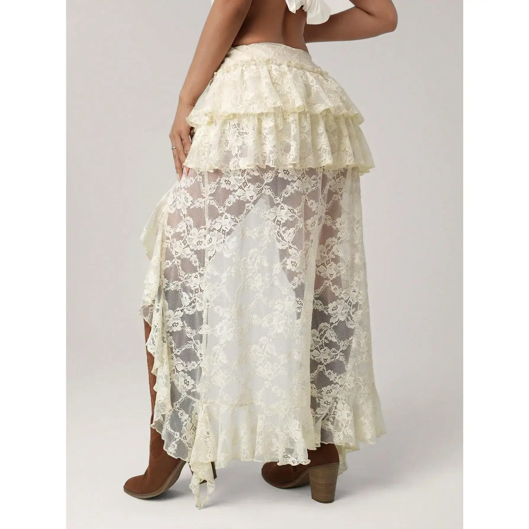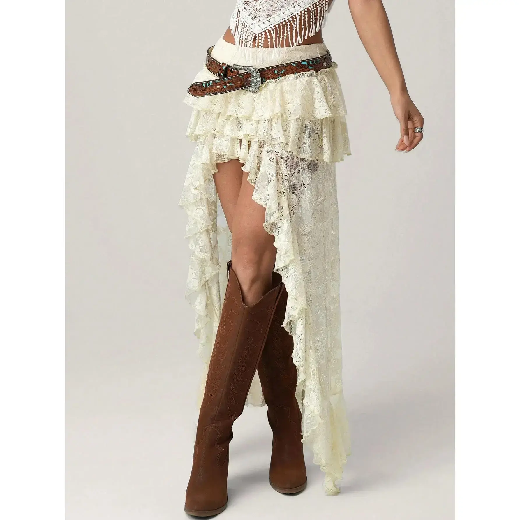 Women's high waisted pleated edge patchwork asymmetrical lace skirtRAIMENTRY