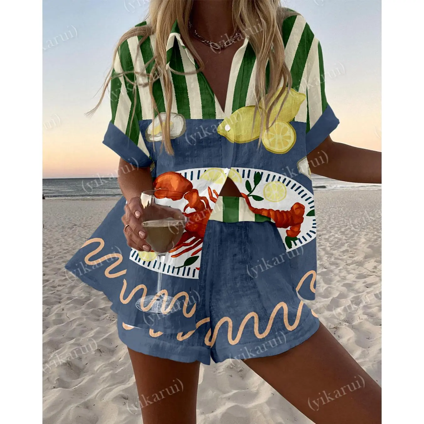 Lemon Shrimp Print Shirt Set, Comfy two-piece set, Summer vacation style, Casual style women's clothing, Mediterranean Pop Style Prints