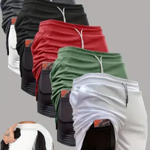 5pcs Men's 2-in-1 Double Layer Shorts With Inner Pocket, High Stretch Sports Shorts For Summer Gym Workout TrainingGiftRAIMENTRY