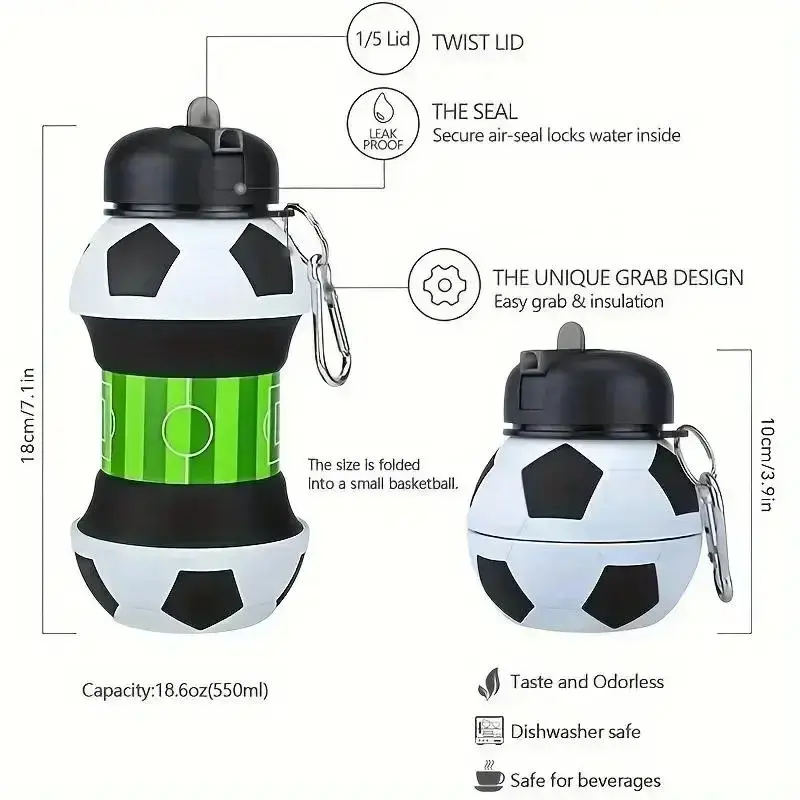 【Foldable Design】: This water bottle folds easily, making it convenient for gym, outdoor activities, and travel. 【Food Grade Silicone】: Made from food-grade silicone, ensuring safe and healthy hydration for all users. 【Large Capacity】: With a capacity of 550ml/18.6oz, this bottle provides ample water for your needs. 【Reusable and Durable】: Constructed from durable materials, this water bottle is reusable and built to last. 【Versatile Use】: Ideal for gym, outdoor activities, and travel, this water bottle meets various hydration needs.