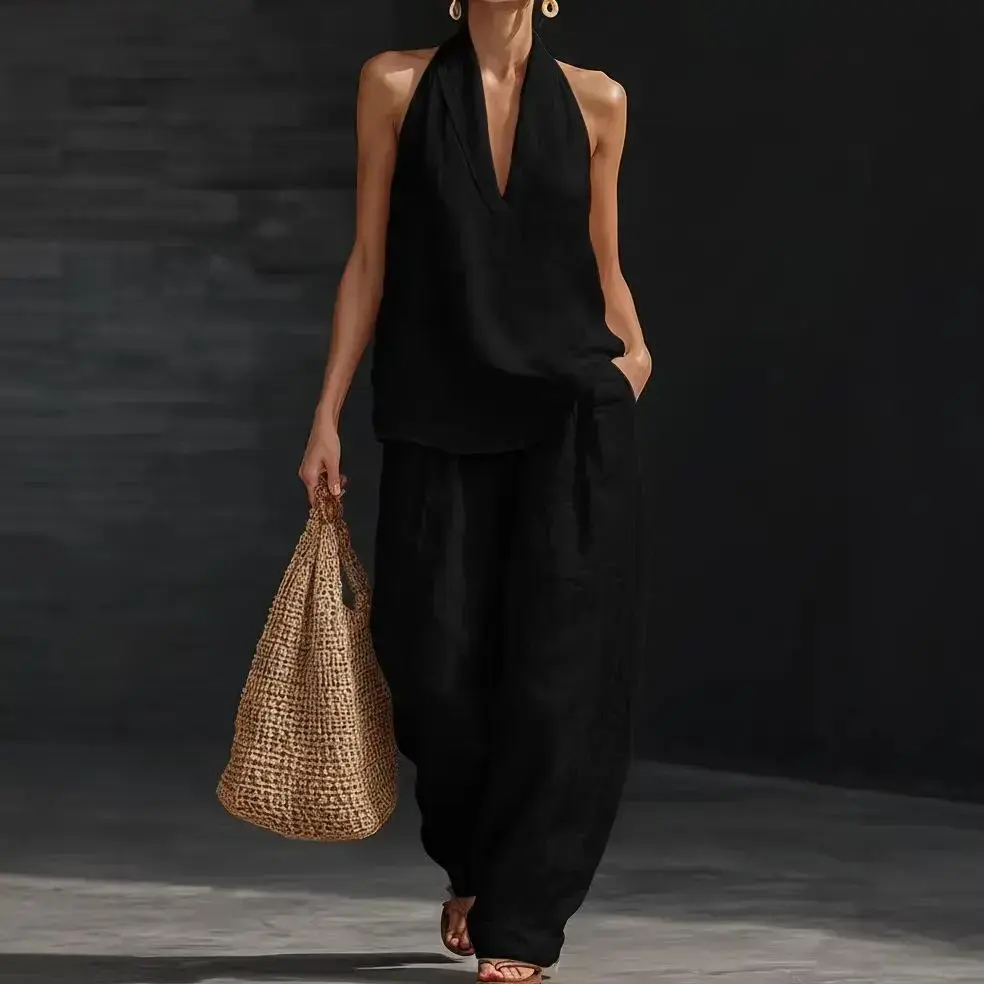 Bohemian linen two-piece set - perfect for beaches, vacations, and brunch! Sleeveless collar top, wide leg pants set, two-piece thread set, wide leg pants super fit, Bohemian fashion casual wear, women's fashion