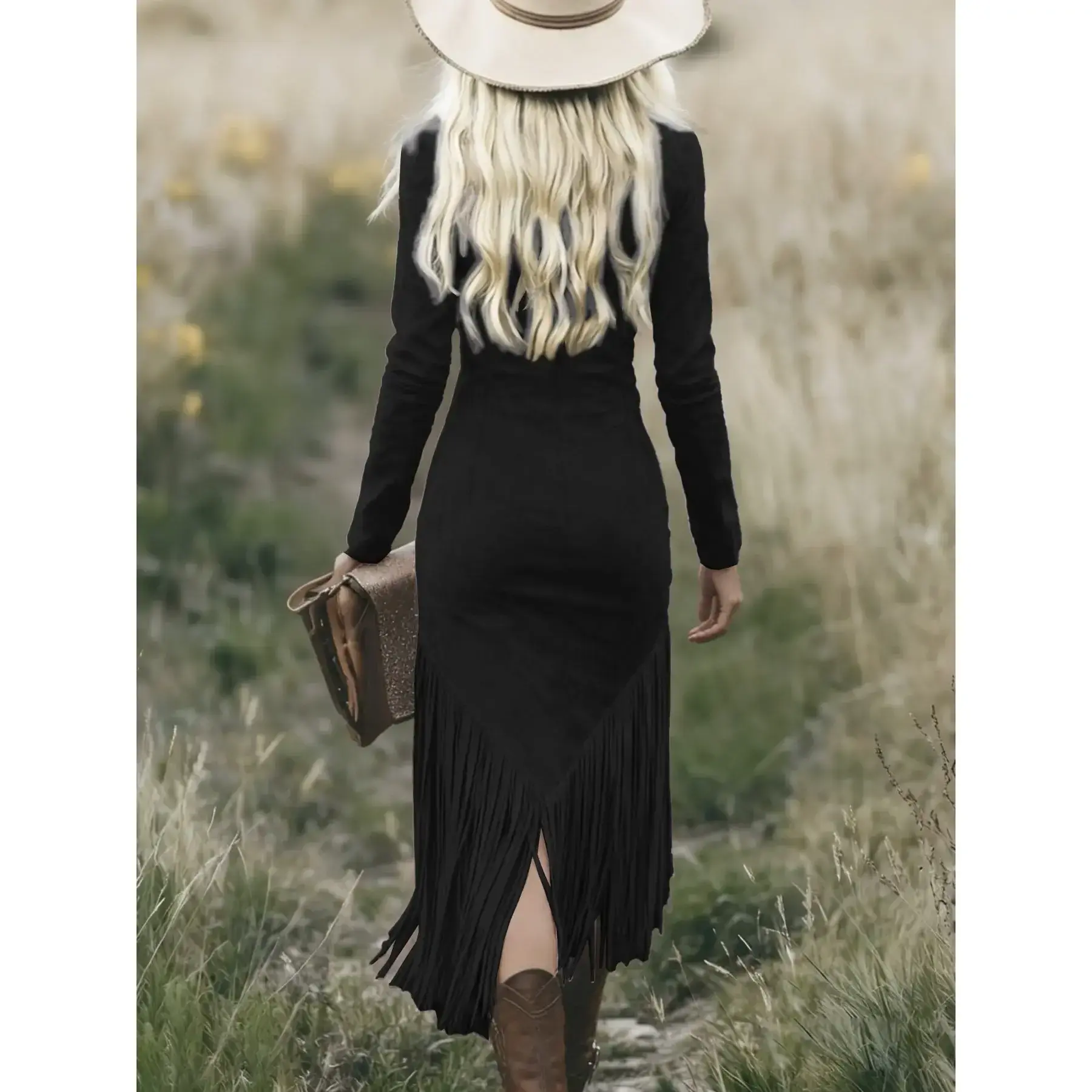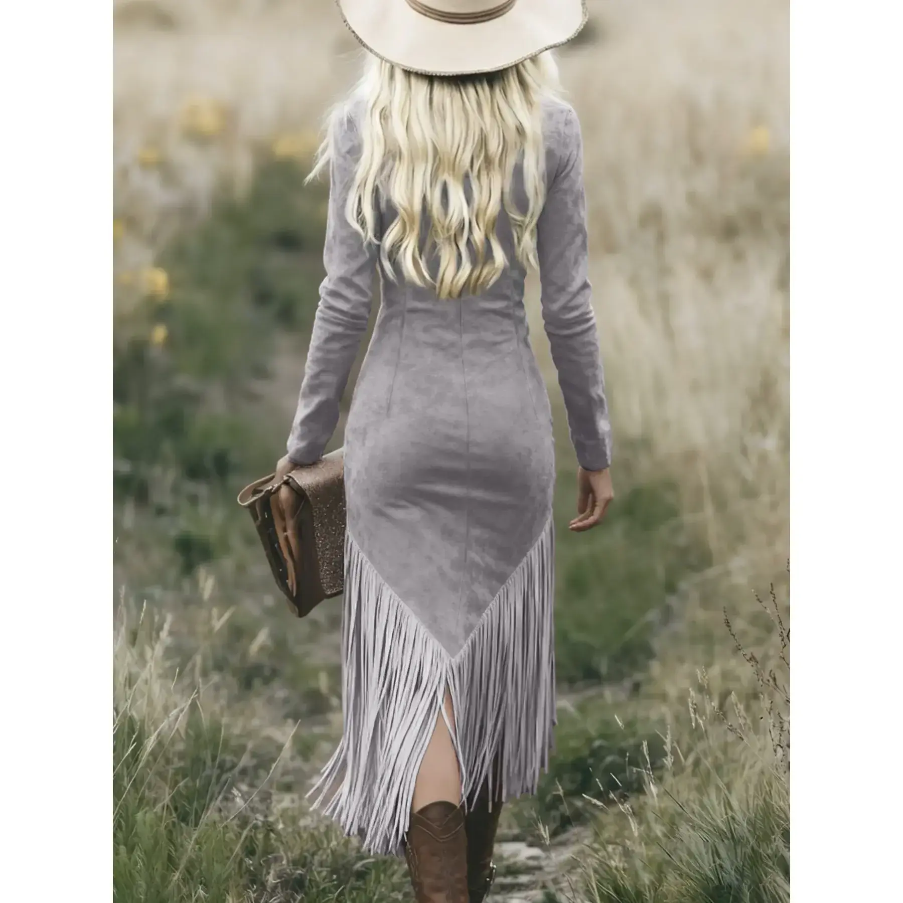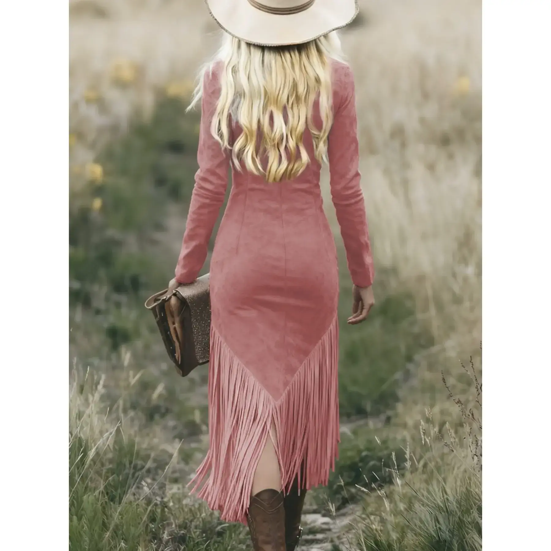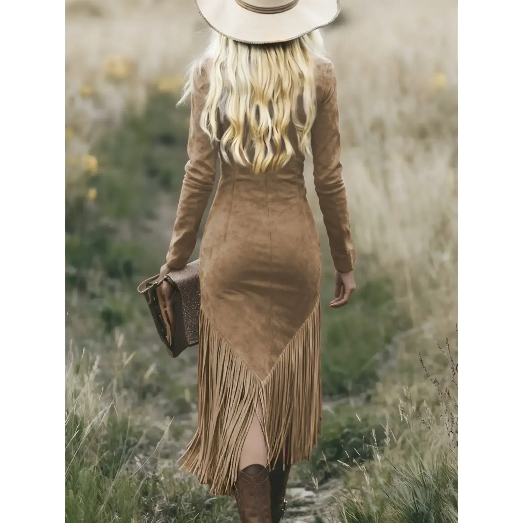 【Faux Suede Material】: Crafted from high-quality faux suede, offering a luxurious feel without compromising ethical standards. 【Slim Fit Silhouette】: Features a slim fit skirt that accentuates your curves, providing a flattering and modern look. 【Tassel Detailing】: Adorned with tassels at the hem, adding a touch of movement and charm to the dress. 【Western Influence】: Inspired by western cowgirl aesthetics, perfect for spring and fall fashion enthusiasts. 【Random Print Design】: Unique random print design adds a playful and distinctive element to the overall appearance.