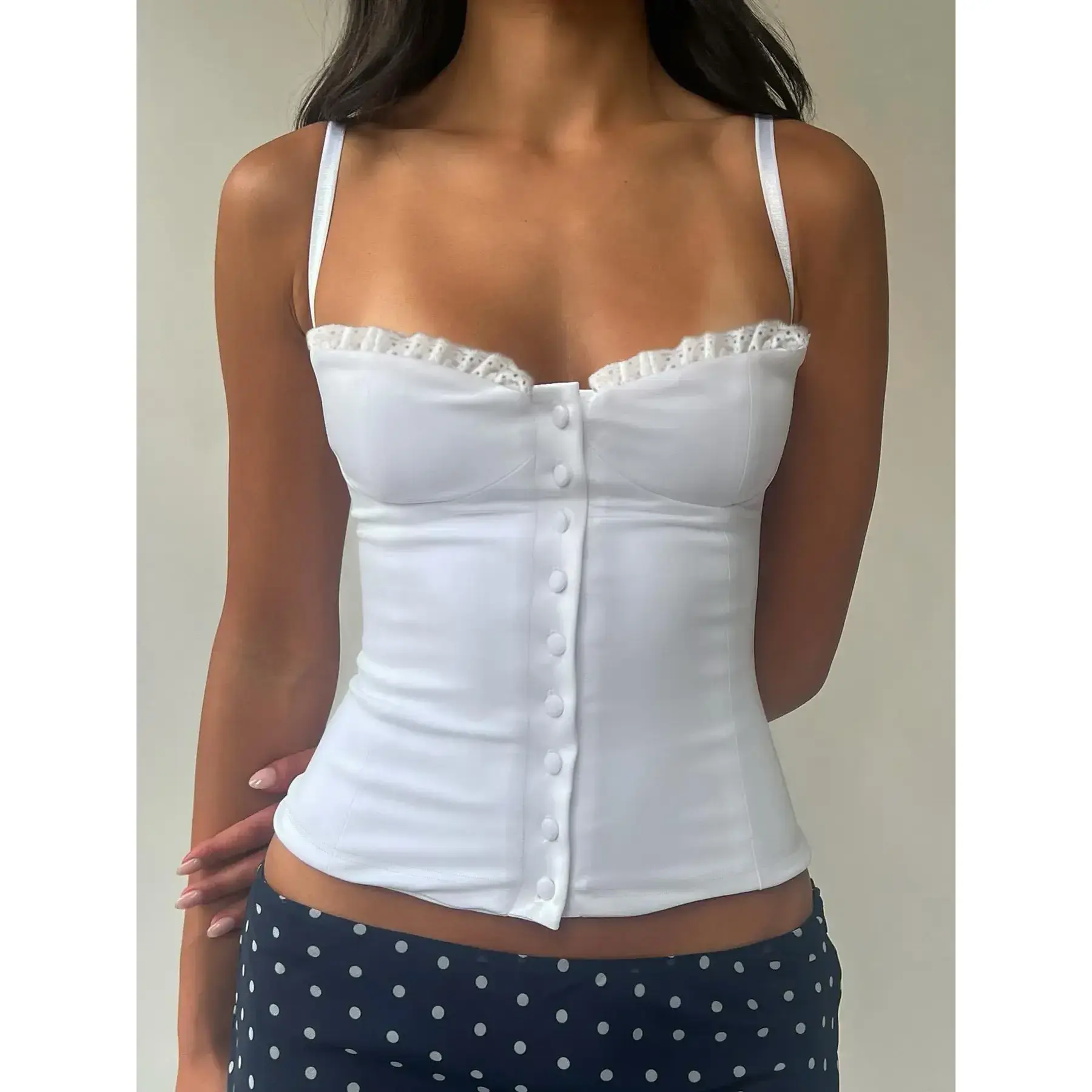 Lace strapless top, button trimmed slim fit vest, elegant women's summer fashion sleeveless top, slim fit shoulder straps