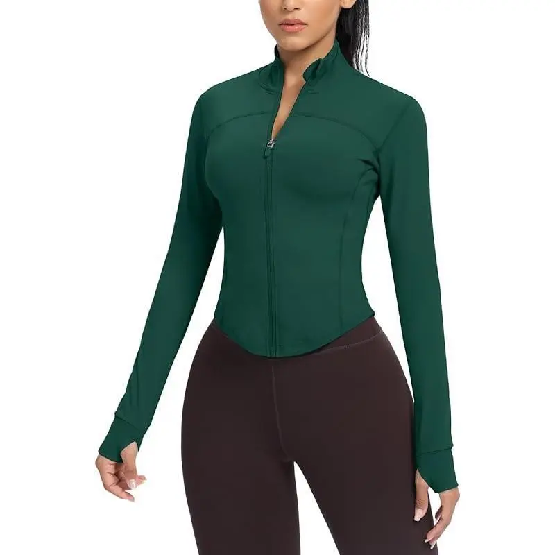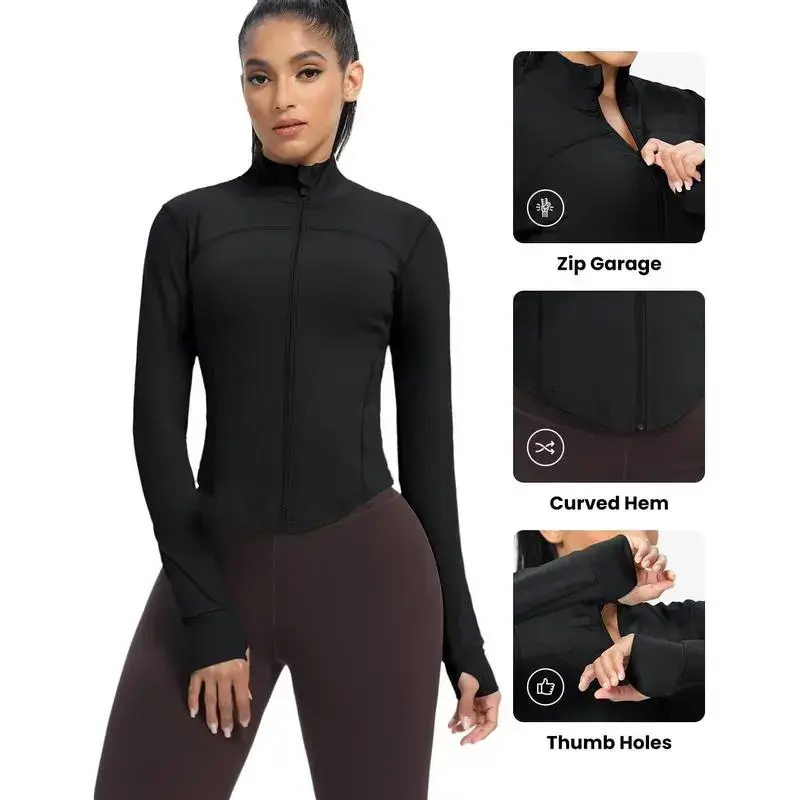 Workout Jackets for Women - We are steadfastly dedicated to crafting exceptional running jackets for women.Whatever your activity-be it fitness training, running, jogging, yoga practice, track or everyday casual wear-this slender, featherweight, and breathable BBL jacket stands out as an unparalleled wardrobe essential Athletic Jacket Women - Crafted from the blend of 87% nylon and 13% lycra, our women's gym jackets offer an exquisite fusion of comfort and stretchability.Suitable for both everyday wear and dedicated workouts, these jackets contour flawlessly to your body, providing a liberating, restriction-free fit.Boasting superior breathability and moisture-wicking properties, they efficiently whisk away sweat during physical exertion, ensuring your body remains comfortably dry and free Women's Workout Tops - Unique Design: The sports jacket showcases a sleek, contemporary design, featuring a streamlined back profile and gracefully curved hemline.Its windproof stand collar serves as an effective barrier against gusts, ensuring warmth is maintained throughout outdoor activities.The thoughtful inclusion of thumbholes in the BBL jacket keeps the sleeves securely in place.The sewing process ensures exceptional resilience against thread breakage and the formation of holes Workout Tops for Women - Zip details: A full-length zipper design simplifies both donning and doffing the garment, while an integrated zip garage ingeniously prevents any discomfort caused by contact between the zipper and the wearer's chin.Furthermore, the meticulous choice of a zipper hue that seamlessly matches the cropped workout jacket's color enhances its overall aesthetic appeal Size & Daily Care: Our full zip slim fit athletic workout jacket offers a tailored, performance-driven silhouette. To ensure the perfect fit, kindly refer to our comprehensive size chart when selecting your yoga jacket. Should you find yourself between sizes, we recommend opting for the larger size to enhance your overall wearing comfort. For maintenance, please launder with like colors, using machine wash settings. It is important to avoid bleach or potent alkaline detergents Sculpts you!Lightweight BBL Jacket Workout Tops - Two Sleeves Choices The video showcases the product in use.The video guides you through product setup.The video compares multiple products.The video shows the product being unpacked. Flaunt Your Hip and Waistline with Cropped Wokout Jackets! All the deatils you like: thumb holes, easy to zip up, buttery soft, snatched, flattering stitching, slim-fit, stretchy and lightweight fabric, crop length, wide range of colors to choose from Perfect for workout: our breathable material lets air go through and wicks sweat away from the skin quickly Pretty Girls Shows of Running Tops, Sports Tops The video showcases the product in use.The video guides you through product setup.The video compares multiple products.The video shows the product being unpacked. If your measurements fall between sizes, opt for the larger size for comfort Cropped Jackets for Running, Workout, Athletic, Hiking, Golf, Track, Yoga, Gym Sculpts the perfect hourglass figure: tight, stretchy-soft fabric with added Lycra, curved seams that create a subtle optical illusion, and a hemline that sits lower in the front and higher at the hips.