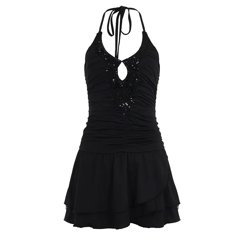 Women's sequin patch deep V-neck sexy backless suspender black dress, fashionable party style elegant sleeveless tight pleated A-line dress
