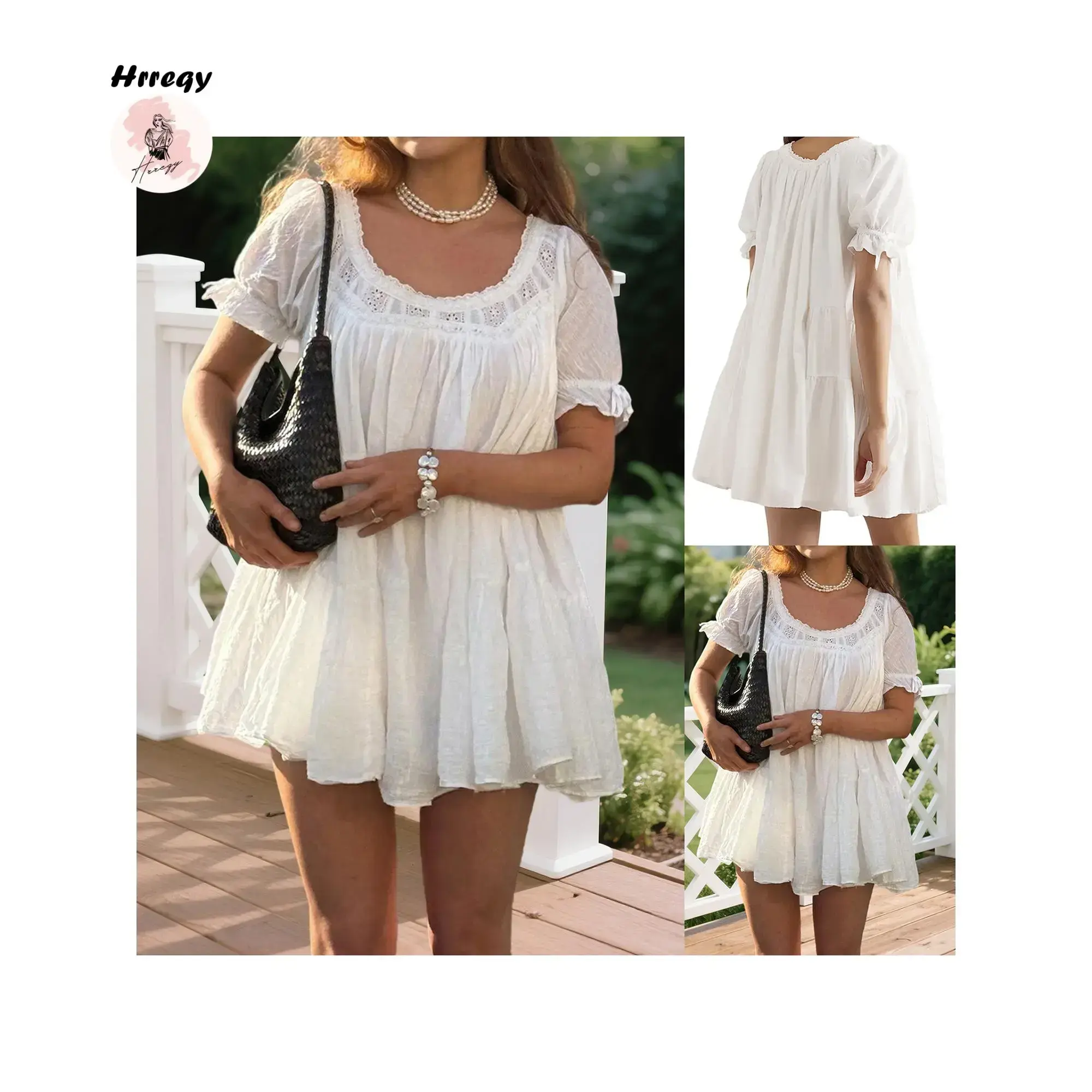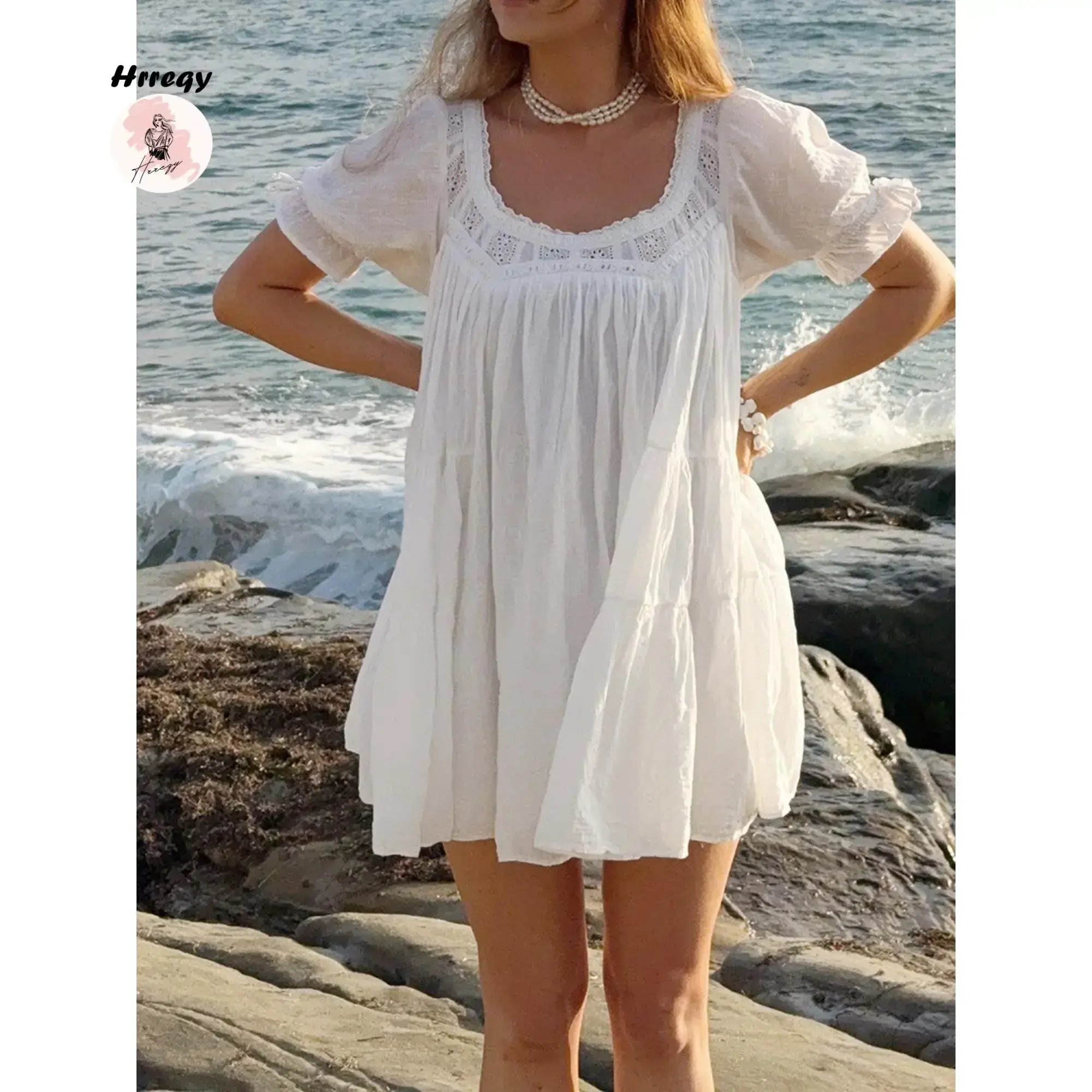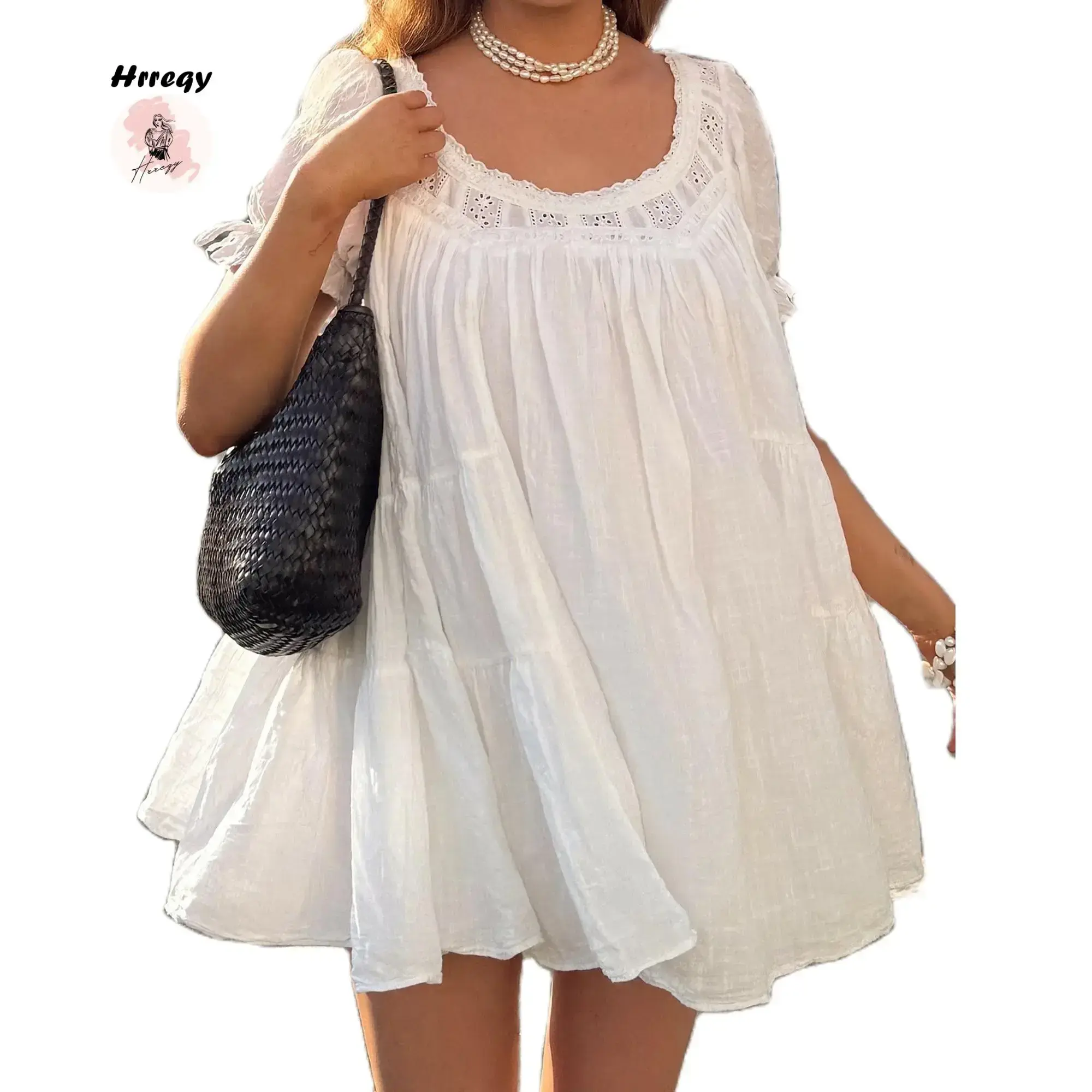 Women's doll mini dress summer solid color loose bubble short sleeved low round neck dressRAIMENTRY