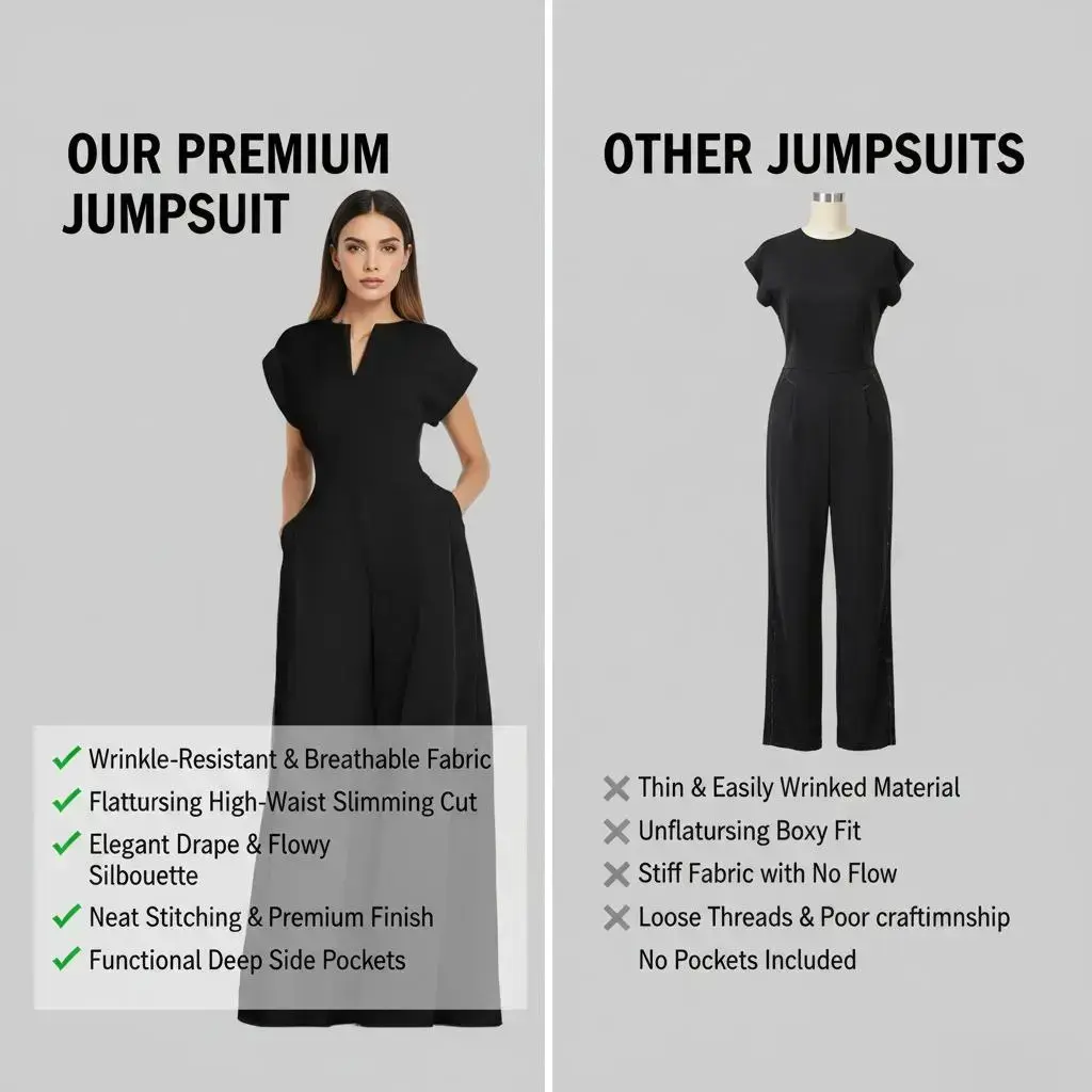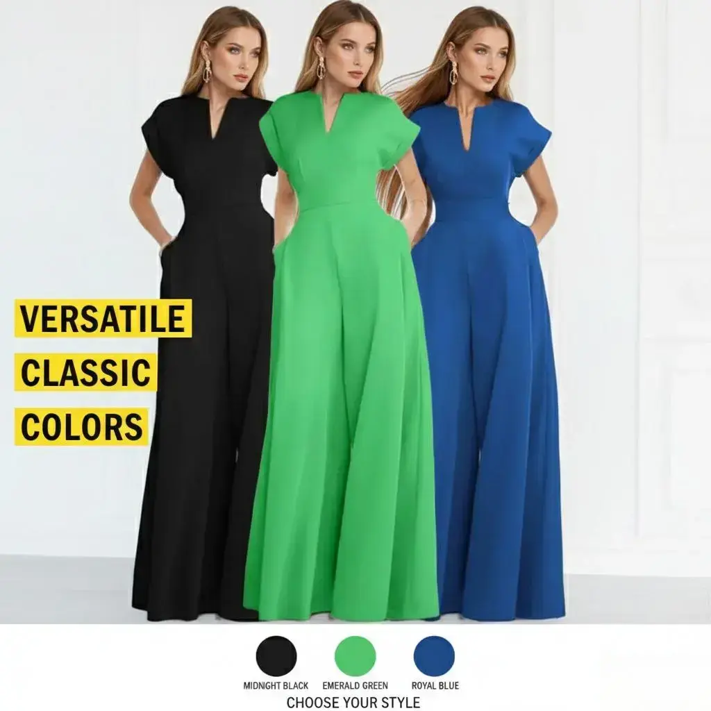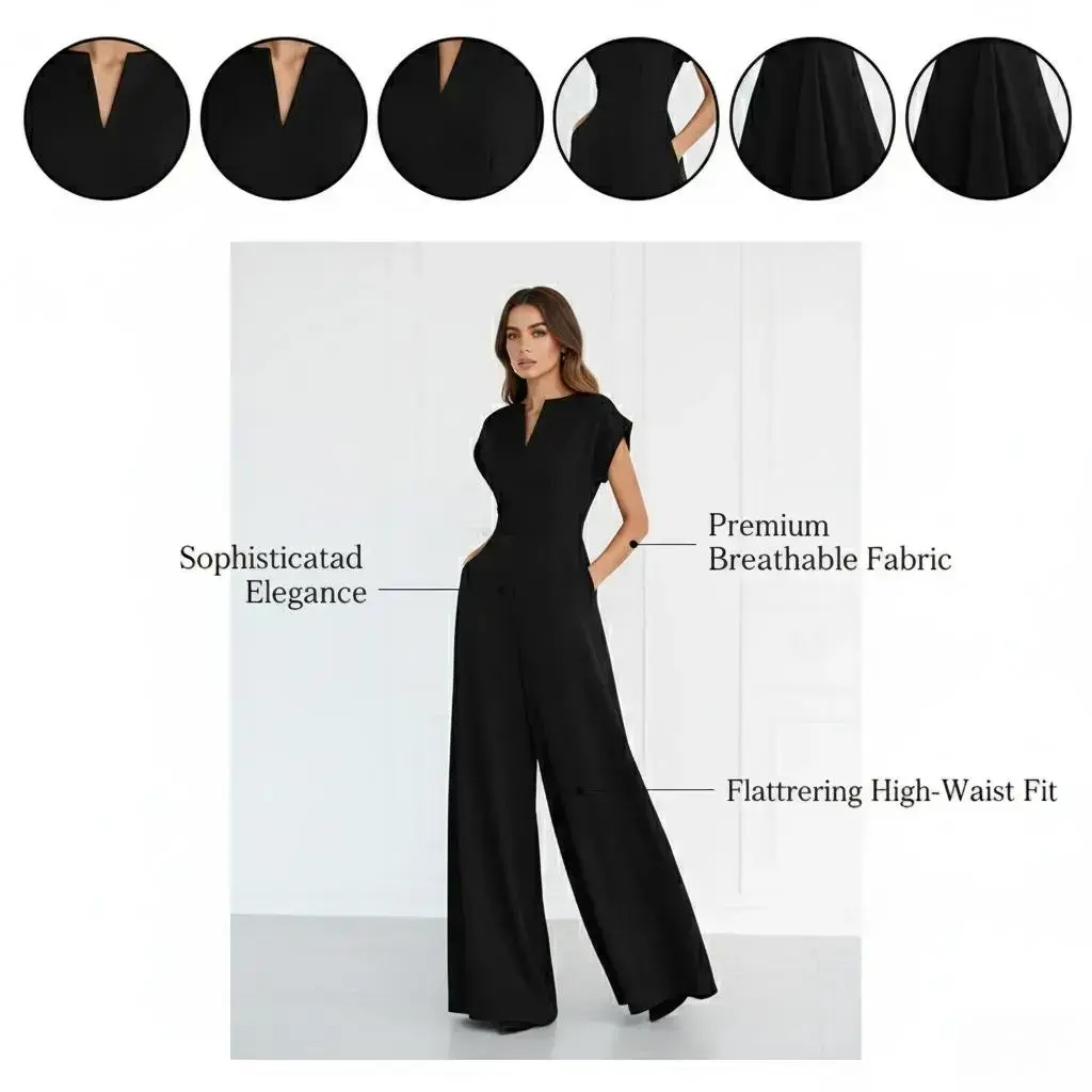 2026 Spring Black Solid Color jumpsuit | V-neck Hat Sleeve High Waist Wide Leg jumpsuitRAIMENTRY