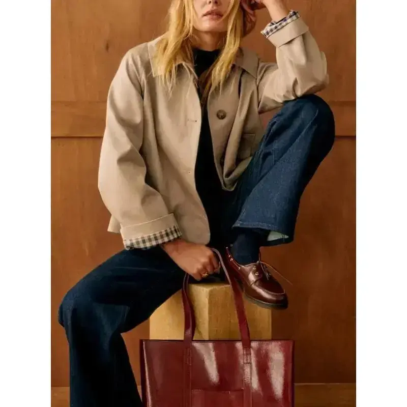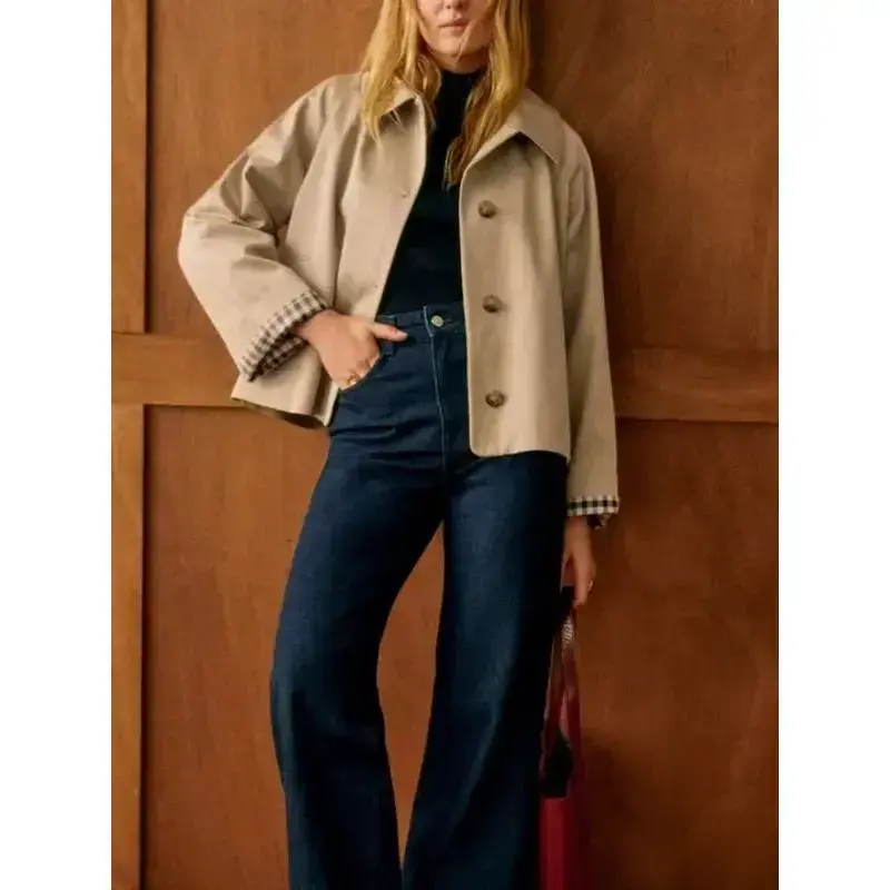 Single breasted women's short windbreaker, interior plaid lapel, women's loose windbreaker, 2025 cotton polyester women'sRAIMENTRY