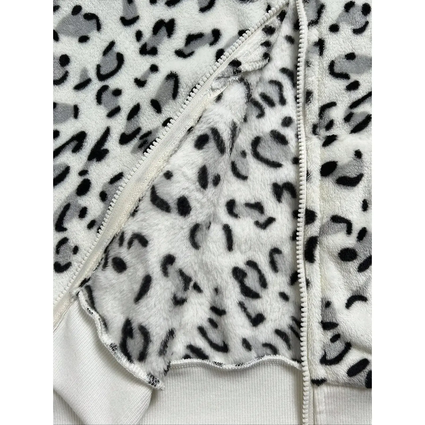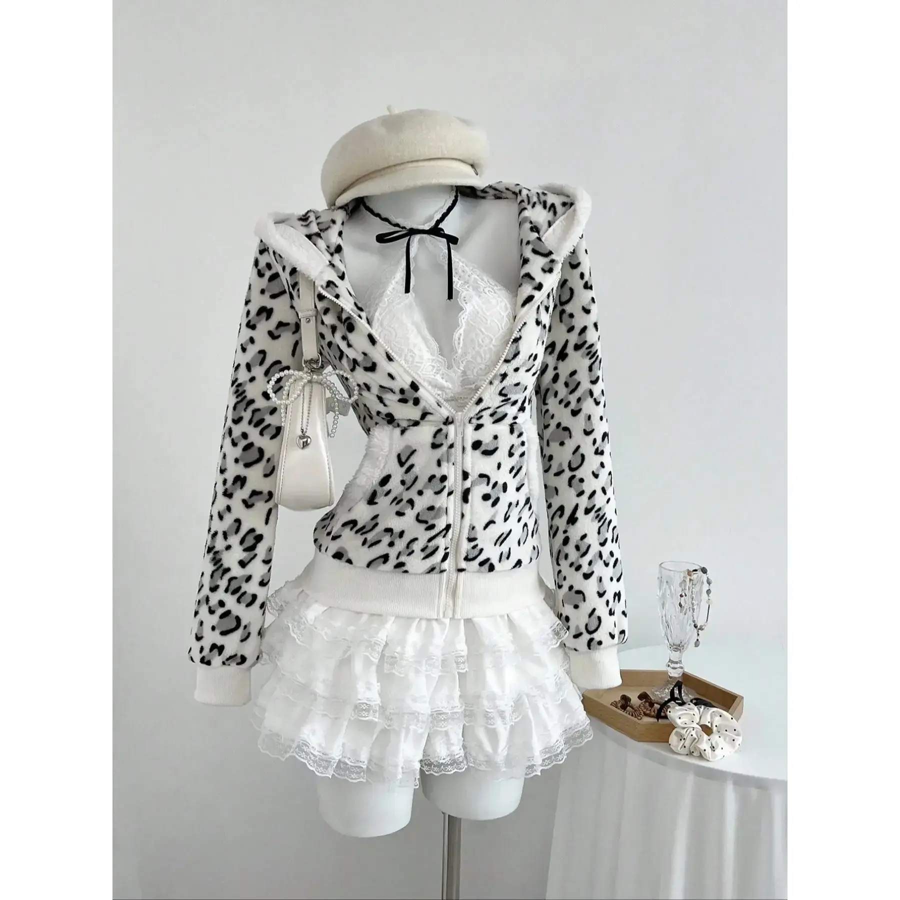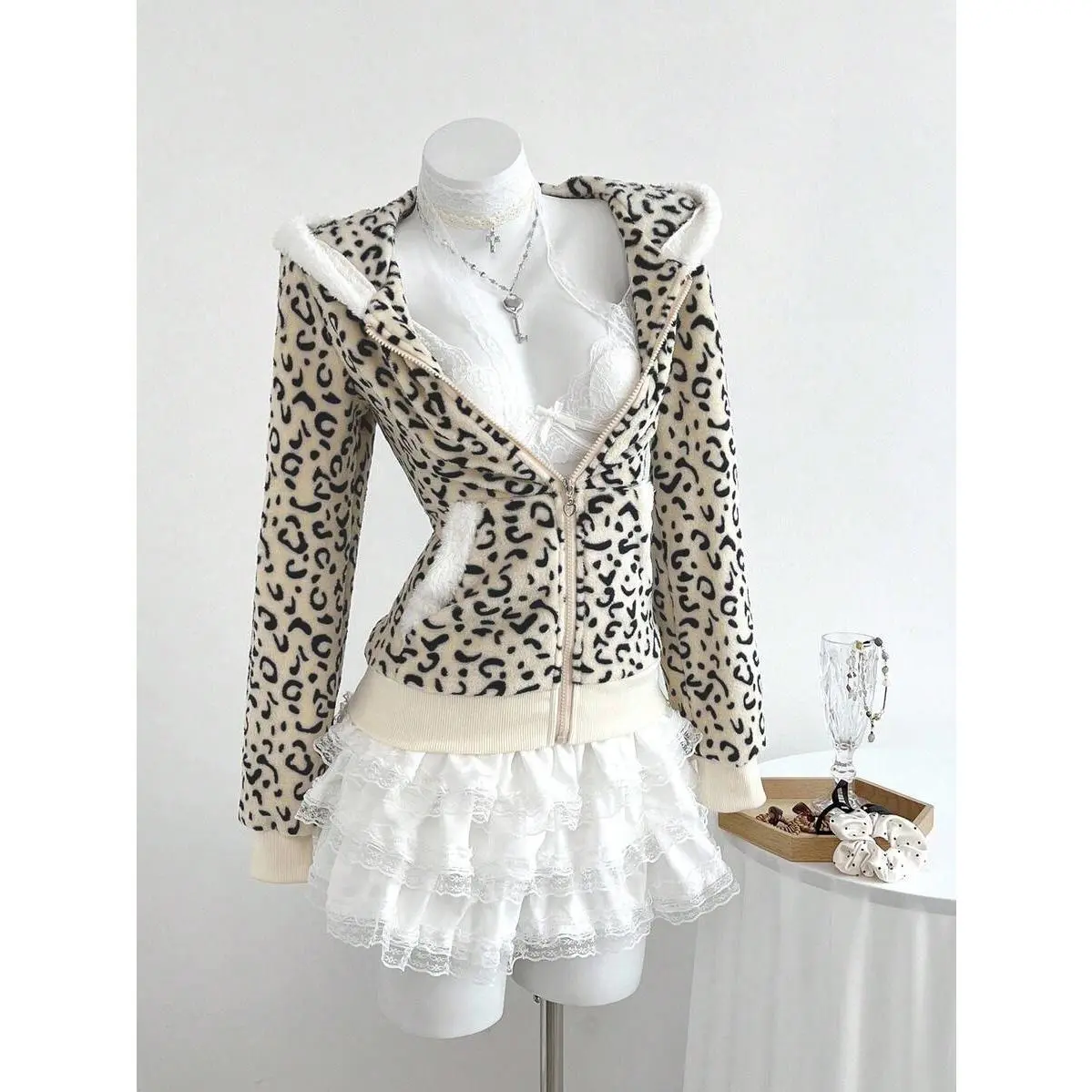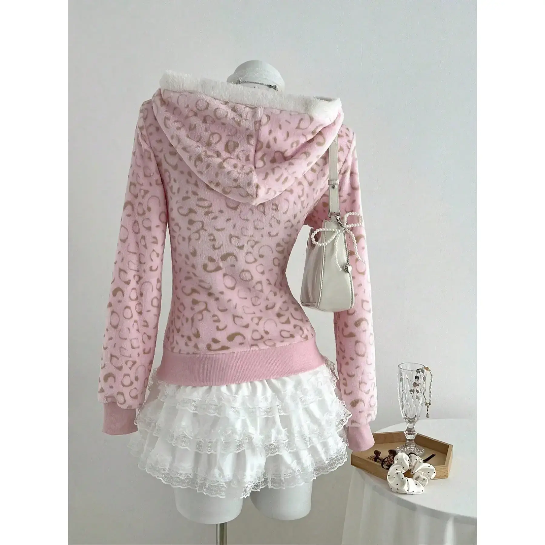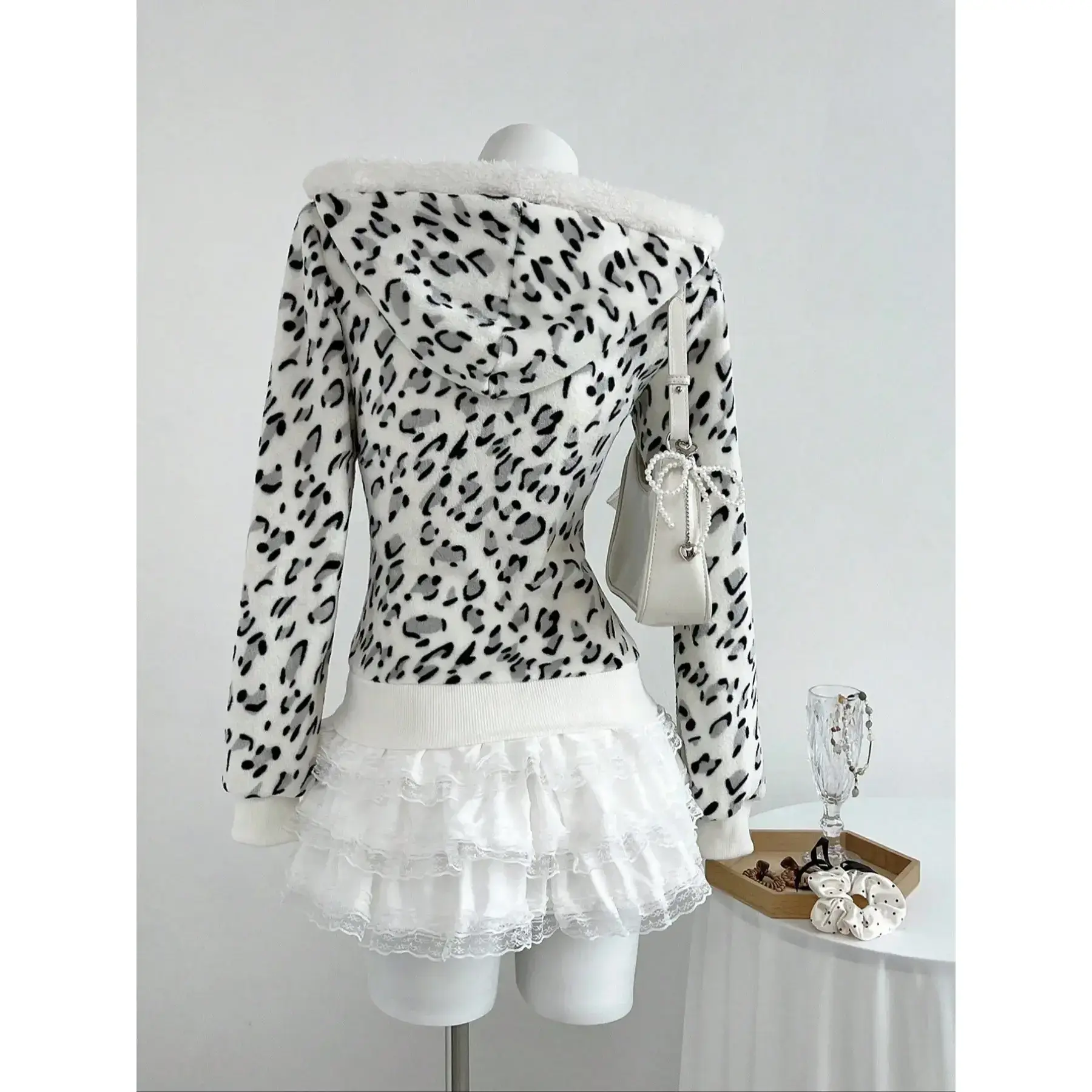 Women's leopard print hooded sports jacket, soft wool lining fitted zipper jacket, autumn and winter casual jacket, back to school home wear, women's clothingRAIMENTRY