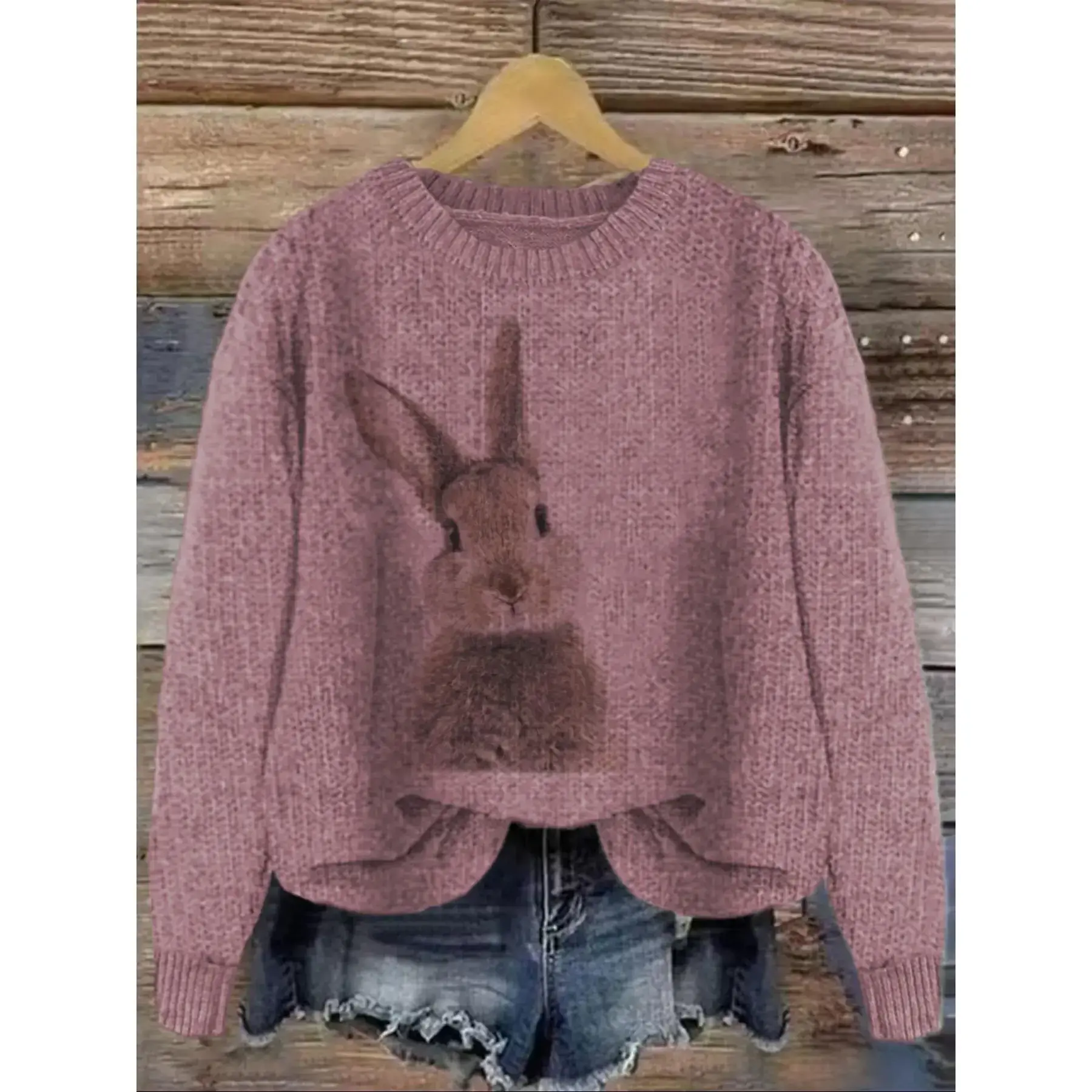 【Rabbit Print Design】: Features a whimsical rabbit print that adds a playful touch, making it a standout in your seasonal wardrobe. 【Seasonal Adaptability】: Ideal for fall and winter, this long sleeve jumper ensures warmth without sacrificing style during colder months. 【Loose-Fitting Silhouette】: The loose-fitting cut allows for easy layering, providing a relaxed feel that's both inviting and unconfined. 【Soft Knit Fabric】: Crafted from soft knitwear, it offers a pleasurable wearing experience that's gentle against your skin. 【Round Neckline】: The round neckline provides a classic look while ensuring ease of wear and comfort during daily activities.