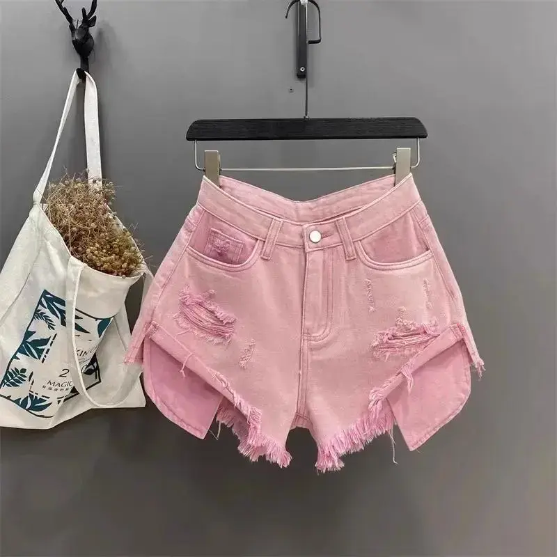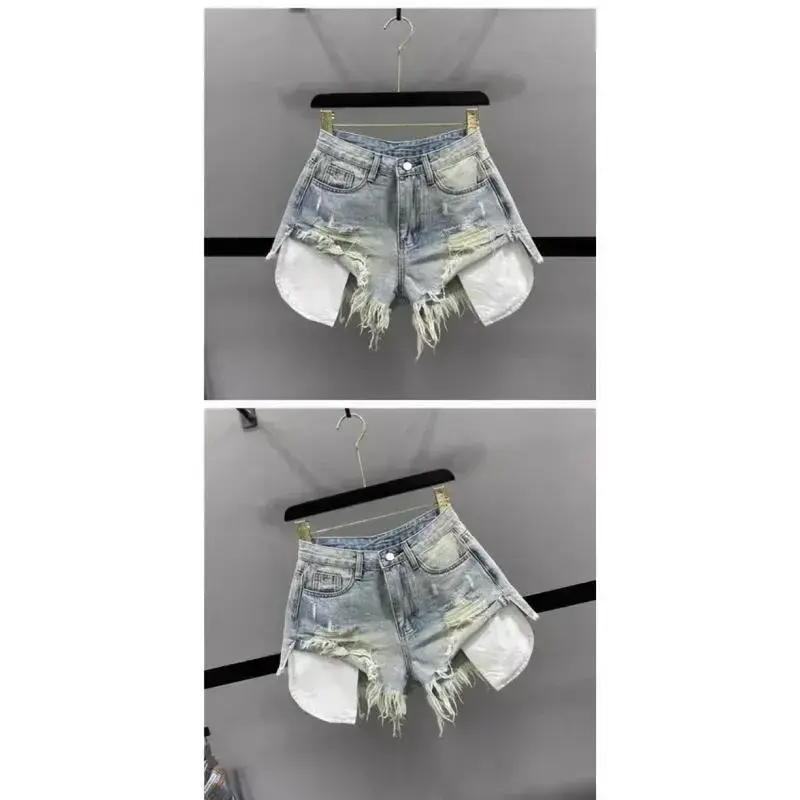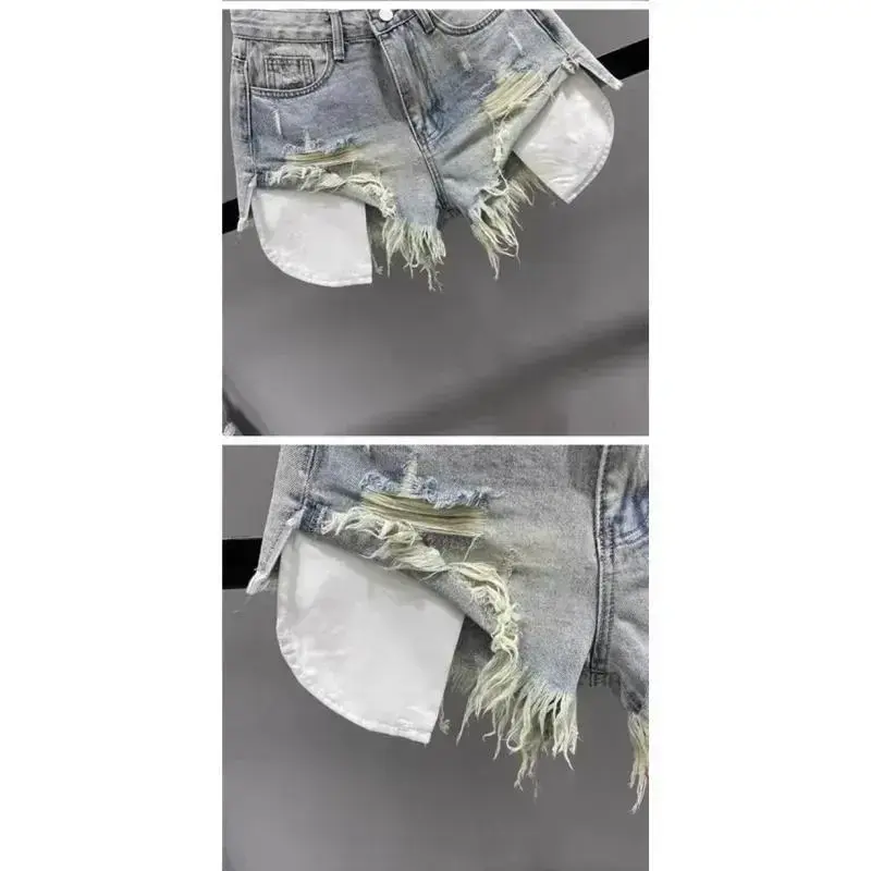 Korean Vintage Blue Sexy Ripped Jeans for Women Patchwork A-line High-waisted Denim Ultra Shorts Bottoms Womenswear
