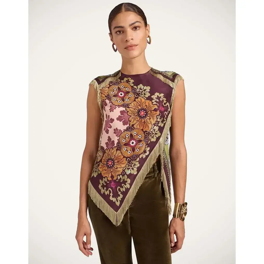 Ethnic retro printed women's elegant round neck tassel cross split irregular top summer sleeveless zipper shirt, irregular tassel cross retro top, women's unique tassel designRAIMENTRY