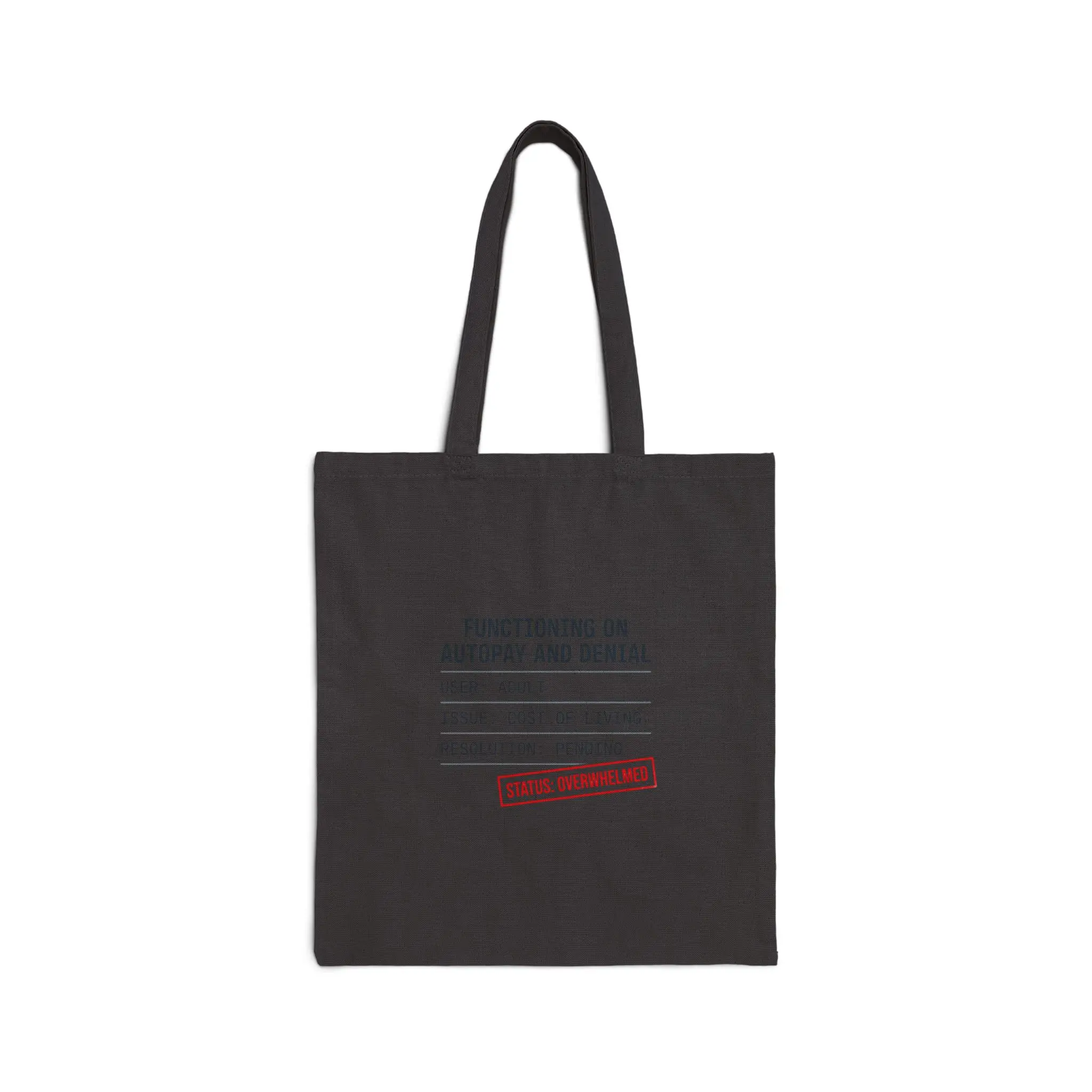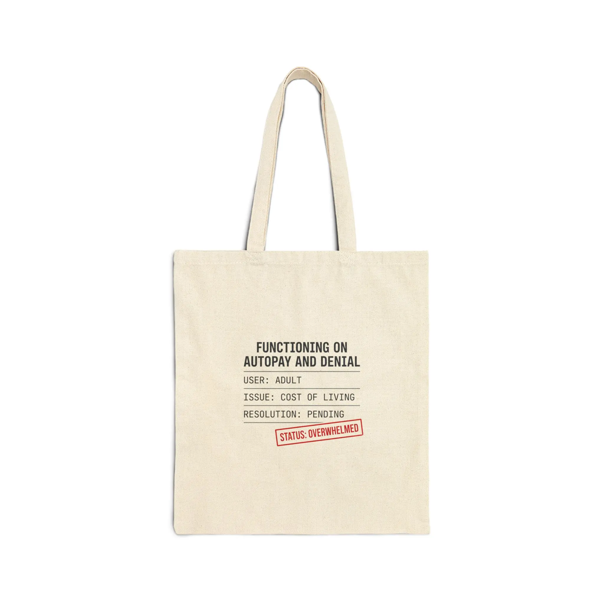 A utilitarian cotton canvas tote stamped with deadpan, faux-official typography about the cost-of-living squeeze. The minimalist “receipt/label” layout and muted ink mimic bureaucratic forms—a subtle, wry badge for weekday errands and grocery runs when budgets are tight. Its plain natural or black canvas keeps the focus on the mock-official message and fits a low-effort, practical aesthetic tied to affordability and everyday nihilism.
